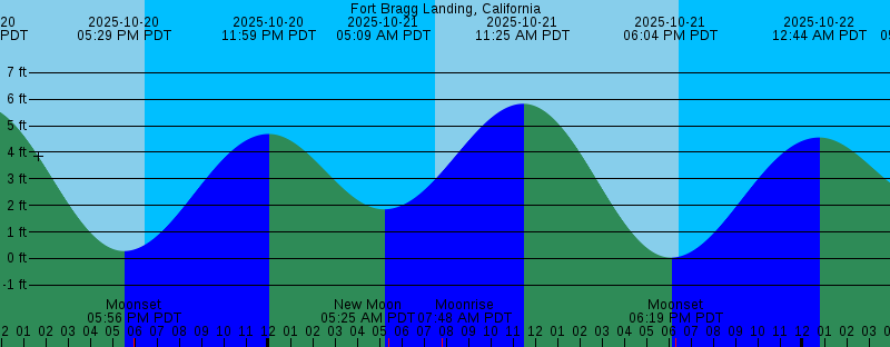 2025-10-20 11:02 AM PDT 5.76 feet High Tide 2025-10-20 05:29 PM PDT 0.28 feet Low Tide 2025-10-20 05:56 PM PDT Moonset 2025-10-20 06:28 PM PDT Sunset 2025-10-20 11:59 PM PDT 4.69 feet High Tide 2025-10-21 05:09 AM PDT 1.85 feet Low Tide 2025-10-21 05:25 AM PDT New Moon 2025-10-21 07:31 AM PDT Sunrise 2025-10-21 07:48 AM PDT Moonrise 2025-10-21 11:25 AM PDT 5.83 feet High Tide 2025-10-21 06:04 PM PDT 0.03 feet Low Tide 2025-10-21 06:19 PM PDT Moonset 2025-10-21 06:27 PM PDT Sunset 2025-10-22 12:44 AM PDT 4.56 feet High Tide 2025-10-22 05:38 AM PDT 2.21 feet Low Tide 2025-10-22 07:32 AM PDT Sunrise 2025-10-22 08:50 AM PDT Moonrise 2025-10-22 11:49 AM PDT 5.84 feet High Tide 2025-10-22 06:25 PM PDT Sunset 2025-10-22 06:39 PM PDT -0.11 feet Low Tide 2025-10-22 06:46 PM PDT Moonset 2025-10-23 01:29 AM PDT 4.42 feet High Tide 2025-10-23 06:06 AM PDT 2.54 feet Low Tide 2025-10-23 07:34 AM PDT Sunrise 2025-10-23 09:52 AM PDT Moonrise 2025-10-23 12:15 PM PDT 5.79 feet High Tide 2025-10-23 06:24 PM PDT Sunset 2025-10-23 07:15 PM PDT -0.13 feet Low Tide 2025-10-23 07:17 PM PDT Moonset 2025-10-24 02:16 AM PDT 4.28 feet High Tide 2025-10-24 06:36 AM PDT 2.82 feet Low Tide 2025-10-24 07:35 AM PDT Sunrise |