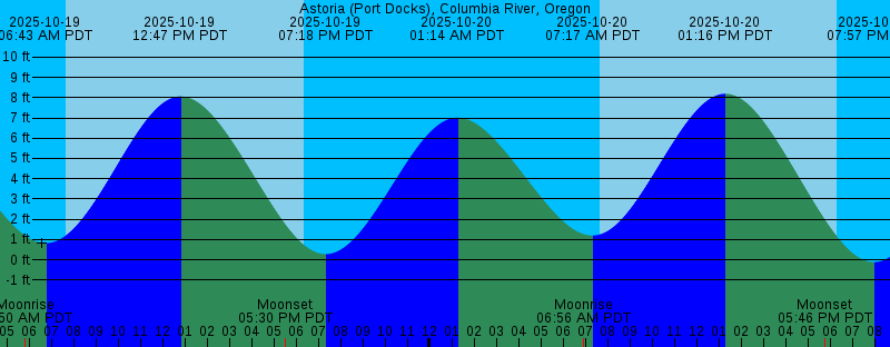 2025-10-19 05:50 AM PDT Moonrise 2025-10-19 06:43 AM PDT 0.82 feet Low Tide 2025-10-19 07:38 AM PDT Sunrise 2025-10-19 12:47 PM PDT 8.06 feet High Tide 2025-10-19 05:30 PM PDT Moonset 2025-10-19 06:21 PM PDT Sunset 2025-10-19 07:18 PM PDT 0.28 feet Low Tide 2025-10-20 01:14 AM PDT 7.02 feet High Tide 2025-10-20 06:56 AM PDT Moonrise 2025-10-20 07:17 AM PDT 1.20 feet Low Tide 2025-10-20 07:40 AM PDT Sunrise 2025-10-20 01:16 PM PDT 8.19 feet High Tide 2025-10-20 05:46 PM PDT Moonset 2025-10-20 06:19 PM PDT Sunset 2025-10-20 07:57 PM PDT -0.12 feet Low Tide 2025-10-21 01:56 AM PDT 6.96 feet High Tide 2025-10-21 05:25 AM PDT New Moon 2025-10-21 07:41 AM PDT Sunrise 2025-10-21 07:49 AM PDT 1.64 feet Low Tide 2025-10-21 08:02 AM PDT Moonrise 2025-10-21 01:42 PM PDT 8.22 feet High Tide 2025-10-21 06:03 PM PDT Moonset 2025-10-21 06:17 PM PDT Sunset 2025-10-21 08:33 PM PDT -0.35 feet Low Tide 2025-10-22 02:38 AM PDT 6.84 feet High Tide 2025-10-22 07:42 AM PDT Sunrise 2025-10-22 08:20 AM PDT 2.11 feet Low Tide 2025-10-22 09:10 AM PDT Moonrise 2025-10-22 02:06 PM PDT 8.19 feet High Tide 2025-10-22 06:16 PM PDT Sunset 2025-10-22 06:25 PM PDT Moonset 2025-10-22 09:07 PM PDT -0.43 feet Low Tide 2025-10-23 03:19 AM PDT 6.66 feet High Tide |