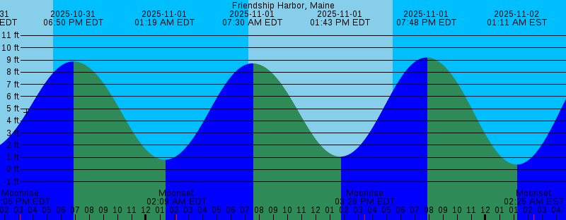 | 2025-10-31 12:44 PM EDT 1.65 feet Low Tide 2025-10-31 03:06 PM EDT Moonrise 2025-10-31 05:28 PM EDT Sunset 2025-10-31 06:50 PM EDT 8.87 feet High Tide 2025-11-01 01:19 AM EDT 0.80 feet Low Tide 2025-11-01 02:09 AM EDT Moonset 2025-11-01 07:14 AM EDT Sunrise 2025-11-01 07:30 AM EDT 8.72 feet High Tide 2025-11-01 01:43 PM EDT 1.06 feet Low Tide 2025-11-01 03:26 PM EDT Moonrise 2025-11-01 05:27 PM EDT Sunset 2025-11-01 07:48 PM EDT 9.20 feet High Tide 2025-11-02 01:11 AM EST 0.41 feet Low Tide 2025-11-02 02:25 AM EST Moonset 2025-11-02 06:15 AM EST Sunrise 2025-11-02 07:21 AM EST 9.42 feet High Tide 2025-11-02 01:39 PM EST 0.33 feet Low Tide 2025-11-02 02:47 PM EST Moonrise 2025-11-02 04:25 PM EST Sunset 2025-11-02 07:44 PM EST 9.57 feet High Tide 2025-11-03 02:01 AM EST 0.01 feet Low Tide 2025-11-03 03:42 AM EST Moonset 2025-11-03 06:16 AM EST Sunrise 2025-11-03 08:09 AM EST 10.16 feet High Tide 2025-11-03 02:32 PM EST -0.43 feet Low Tide 2025-11-03 03:09 PM EST Moonrise 2025-11-03 04:24 PM EST Sunset 2025-11-03 08:37 PM EST 9.91 feet High Tide 2025-11-04 02:49 AM EST -0.33 feet Low Tide 2025-11-04 05:04 AM EST Moonset 2025-11-04 06:18 AM EST Sunrise | Other Nearby Tide Stations |