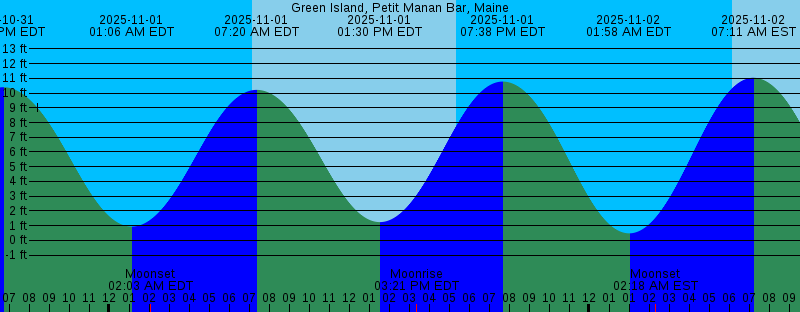 | 2025-10-31 03:00 PM EDT Moonrise 2025-10-31 05:21 PM EDT Sunset 2025-10-31 06:40 PM EDT 10.40 feet High Tide 2025-11-01 01:06 AM EDT 0.94 feet Low Tide 2025-11-01 02:03 AM EDT Moonset 2025-11-01 07:09 AM EDT Sunrise 2025-11-01 07:20 AM EDT 10.22 feet High Tide 2025-11-01 01:30 PM EDT 1.24 feet Low Tide 2025-11-01 03:21 PM EDT Moonrise 2025-11-01 05:20 PM EDT Sunset 2025-11-01 07:38 PM EDT 10.78 feet High Tide 2025-11-02 01:58 AM EDT 0.48 feet Low Tide 2025-11-02 02:18 AM EST Moonset 2025-11-02 06:10 AM EST Sunrise 2025-11-02 07:11 AM EST 11.04 feet High Tide 2025-11-02 01:26 PM EST 0.39 feet Low Tide 2025-11-02 02:41 PM EST Moonrise 2025-11-02 04:19 PM EST Sunset 2025-11-02 07:34 PM EST 11.22 feet High Tide 2025-11-03 01:48 AM EST 0.01 feet Low Tide 2025-11-03 03:37 AM EST Moonset 2025-11-03 06:11 AM EST Sunrise 2025-11-03 07:59 AM EST 11.90 feet High Tide 2025-11-03 02:19 PM EST -0.50 feet Low Tide 2025-11-03 03:02 PM EST Moonrise 2025-11-03 04:17 PM EST Sunset 2025-11-03 08:27 PM EST 11.62 feet High Tide 2025-11-04 02:36 AM EST -0.38 feet Low Tide 2025-11-04 04:59 AM EST Moonset 2025-11-04 06:13 AM EST Sunrise 2025-11-04 08:46 AM EST 12.69 feet High Tide | Other Nearby Tide Stations |