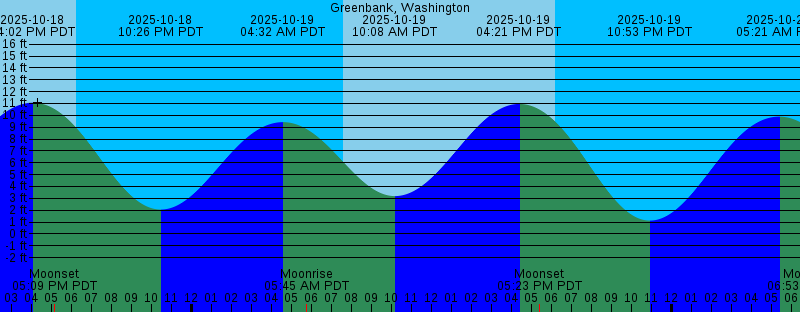 2025-10-18 09:23 AM PDT 2.37 feet Low Tide 2025-10-18 04:02 PM PDT 11.06 feet High Tide 2025-10-18 05:09 PM PDT Moonset 2025-10-18 06:15 PM PDT Sunset 2025-10-18 10:26 PM PDT 2.05 feet Low Tide 2025-10-19 04:32 AM PDT 9.43 feet High Tide 2025-10-19 05:45 AM PDT Moonrise 2025-10-19 07:36 AM PDT Sunrise 2025-10-19 10:08 AM PDT 3.19 feet Low Tide 2025-10-19 04:21 PM PDT 10.96 feet High Tide 2025-10-19 05:23 PM PDT Moonset 2025-10-19 06:13 PM PDT Sunset 2025-10-19 10:53 PM PDT 1.12 feet Low Tide 2025-10-20 05:21 AM PDT 9.89 feet High Tide 2025-10-20 06:53 AM PDT Moonrise 2025-10-20 07:37 AM PDT Sunrise 2025-10-20 10:49 AM PDT 4.11 feet Low Tide 2025-10-20 04:39 PM PDT 10.82 feet High Tide 2025-10-20 05:37 PM PDT Moonset 2025-10-20 06:11 PM PDT Sunset 2025-10-20 11:18 PM PDT 0.33 feet Low Tide 2025-10-21 05:25 AM PDT New Moon 2025-10-21 06:04 AM PDT 10.30 feet High Tide 2025-10-21 07:39 AM PDT Sunrise 2025-10-21 08:02 AM PDT Moonrise 2025-10-21 11:27 AM PDT 5.04 feet Low Tide 2025-10-21 04:59 PM PDT 10.64 feet High Tide 2025-10-21 05:53 PM PDT Moonset 2025-10-21 06:09 PM PDT Sunset 2025-10-21 11:44 PM PDT -0.30 feet Low Tide 2025-10-22 06:44 AM PDT 10.66 feet High Tide 2025-10-22 07:40 AM PDT Sunrise |
