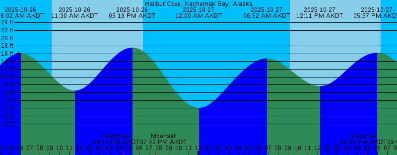 2025-10-26 06:02 AM AKDT 16.08 feet High Tide 2025-10-26 09:11 AM AKDT Sunrise 2025-10-26 11:30 AM AKDT 6.54 feet Low Tide 2025-10-26 04:27 PM AKDT Moonrise 2025-10-26 05:19 PM AKDT 17.58 feet High Tide 2025-10-26 06:24 PM AKDT Sunset 2025-10-26 07:40 PM AKDT Moonset 2025-10-27 12:00 AM AKDT 2.11 feet Low Tide 2025-10-27 06:52 AM AKDT 14.79 feet High Tide 2025-10-27 09:14 AM AKDT Sunrise 2025-10-27 12:11 PM AKDT 7.68 feet Low Tide 2025-10-27 04:51 PM AKDT Moonrise 2025-10-27 05:57 PM AKDT 16.27 feet High Tide 2025-10-27 06:22 PM AKDT Sunset 2025-10-27 09:04 PM AKDT Moonset 2025-10-28 12:48 AM AKDT 3.27 feet Low Tide 2025-10-28 07:56 AM AKDT 13.83 feet High Tide 2025-10-28 09:16 AM AKDT Sunrise 2025-10-28 01:08 PM AKDT 8.64 feet Low Tide 2025-10-28 05:01 PM AKDT Moonrise 2025-10-28 06:19 PM AKDT Sunset 2025-10-28 06:51 PM AKDT 14.97 feet High Tide 2025-10-28 10:40 PM AKDT Moonset 2025-10-29 01:53 AM AKDT 4.19 feet Low Tide 2025-10-29 08:22 AM AKDT First Quarter 2025-10-29 09:17 AM AKDT 13.61 feet High Tide 2025-10-29 09:19 AM AKDT Sunrise 2025-10-29 02:33 PM AKDT 8.99 feet Low Tide 2025-10-29 05:06 PM AKDT Moonrise 2025-10-29 06:16 PM AKDT Sunset 2025-10-29 08:15 PM AKDT 14.02 feet High Tide 2025-10-30 12:18 AM AKDT Moonset |