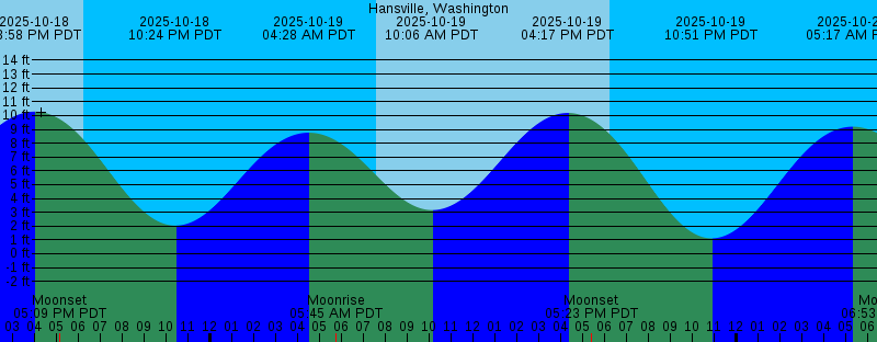 2025-10-18 09:21 AM PDT 2.35 feet Low Tide 2025-10-18 03:58 PM PDT 10.28 feet High Tide 2025-10-18 05:09 PM PDT Moonset 2025-10-18 06:15 PM PDT Sunset 2025-10-18 10:24 PM PDT 2.03 feet Low Tide 2025-10-19 04:28 AM PDT 8.76 feet High Tide 2025-10-19 05:45 AM PDT Moonrise 2025-10-19 07:36 AM PDT Sunrise 2025-10-19 10:06 AM PDT 3.16 feet Low Tide 2025-10-19 04:17 PM PDT 10.19 feet High Tide 2025-10-19 05:23 PM PDT Moonset 2025-10-19 06:13 PM PDT Sunset 2025-10-19 10:51 PM PDT 1.11 feet Low Tide 2025-10-20 05:17 AM PDT 9.19 feet High Tide 2025-10-20 06:53 AM PDT Moonrise 2025-10-20 07:37 AM PDT Sunrise 2025-10-20 10:47 AM PDT 4.07 feet Low Tide 2025-10-20 04:35 PM PDT 10.06 feet High Tide 2025-10-20 05:37 PM PDT Moonset 2025-10-20 06:11 PM PDT Sunset 2025-10-20 11:16 PM PDT 0.33 feet Low Tide 2025-10-21 05:25 AM PDT New Moon 2025-10-21 06:00 AM PDT 9.58 feet High Tide 2025-10-21 07:39 AM PDT Sunrise 2025-10-21 08:01 AM PDT Moonrise 2025-10-21 11:25 AM PDT 4.99 feet Low Tide 2025-10-21 04:55 PM PDT 9.89 feet High Tide 2025-10-21 05:53 PM PDT Moonset 2025-10-21 06:09 PM PDT Sunset 2025-10-21 11:42 PM PDT -0.30 feet Low Tide 2025-10-22 06:40 AM PDT 9.90 feet High Tide 2025-10-22 07:40 AM PDT Sunrise |