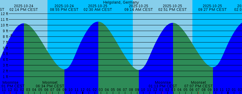 2025-10-24 08:14 AM CEST Sunrise 2025-10-24 08:42 AM CEST 2.13 feet Low Tide 2025-10-24 12:01 PM CEST Moonrise 2025-10-24 02:14 PM CEST 10.34 feet High Tide 2025-10-24 06:10 PM CEST Sunset 2025-10-24 06:34 PM CEST Moonset 2025-10-24 08:55 PM CEST 2.31 feet Low Tide 2025-10-25 02:30 AM CEST 10.63 feet High Tide 2025-10-25 08:16 AM CEST Sunrise 2025-10-25 09:14 AM CEST 2.20 feet Low Tide 2025-10-25 01:13 PM CEST Moonrise 2025-10-25 02:51 PM CEST 10.42 feet High Tide 2025-10-25 06:07 PM CEST Sunset 2025-10-25 07:07 PM CEST Moonset 2025-10-25 09:27 PM CEST 2.67 feet Low Tide 2025-10-26 02:07 AM CET 10.74 feet High Tide 2025-10-26 07:18 AM CET Sunrise 2025-10-26 08:48 AM CET 2.68 feet Low Tide 2025-10-26 01:12 PM CET Moonrise 2025-10-26 02:29 PM CET 10.29 feet High Tide 2025-10-26 05:05 PM CET Sunset 2025-10-26 06:54 PM CET Moonset 2025-10-26 08:59 PM CET 3.42 feet Low Tide 2025-10-27 02:40 AM CET 10.67 feet High Tide 2025-10-27 07:19 AM CET Sunrise 2025-10-27 09:22 AM CET 3.45 feet Low Tide 2025-10-27 01:57 PM CET Moonrise 2025-10-27 03:02 PM CET 9.96 feet High Tide 2025-10-27 05:03 PM CET Sunset 2025-10-27 07:57 PM CET Moonset 2025-10-27 09:27 PM CET 4.29 feet Low Tide |