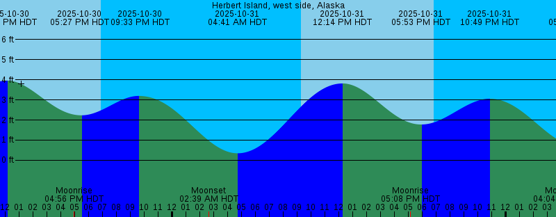 Note: Reference is in time zone :America/Nome; adjusted offsets 1 hr to undo LST compensation. 2025-10-30 09:14 AM HDT Sunrise 2025-10-30 12:07 PM HDT 3.96 feet High Tide 2025-10-30 04:56 PM HDT Moonrise 2025-10-30 05:27 PM HDT 2.23 feet Low Tide 2025-10-30 06:52 PM HDT Sunset 2025-10-30 09:33 PM HDT 3.20 feet High Tide 2025-10-31 02:39 AM HDT Moonset 2025-10-31 04:41 AM HDT 0.34 feet Low Tide 2025-10-31 09:16 AM HDT Sunrise 2025-10-31 12:14 PM HDT 3.82 feet High Tide 2025-10-31 05:08 PM HDT Moonrise 2025-10-31 05:53 PM HDT 1.78 feet Low Tide 2025-10-31 06:50 PM HDT Sunset 2025-10-31 10:49 PM HDT 3.06 feet High Tide 2025-11-01 04:04 AM HDT Moonset 2025-11-01 05:12 AM HDT 0.69 feet Low Tide 2025-11-01 09:18 AM HDT Sunrise 2025-11-01 12:19 PM HDT 3.80 feet High Tide 2025-11-01 05:19 PM HDT Moonrise 2025-11-01 06:29 PM HDT 1.21 feet Low Tide 2025-11-01 06:48 PM HDT Sunset 2025-11-02 12:14 AM HDT 2.96 feet High Tide 2025-11-02 04:30 AM HST Moonset 2025-11-02 04:45 AM HST 1.15 feet Low Tide 2025-11-02 08:20 AM HST Sunrise 2025-11-02 11:29 AM HST 3.94 feet High Tide 2025-11-02 04:30 PM HST Moonrise 2025-11-02 05:47 PM HST Sunset 2025-11-02 06:13 PM HST 0.58 feet Low Tide 2025-11-03 12:46 AM HST 2.99 feet High Tide 2025-11-03 05:21 AM HST 1.67 feet Low Tide 2025-11-03 06:00 AM HST Moonset |