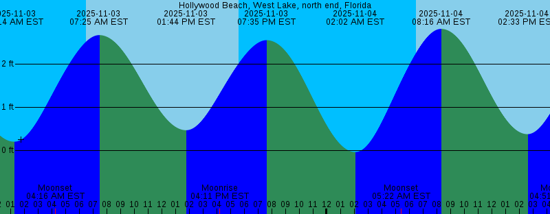 2025-11-03 01:14 AM EST 0.20 feet Low Tide 2025-11-03 04:16 AM EST Moonset 2025-11-03 06:30 AM EST Sunrise 2025-11-03 07:25 AM EST 2.67 feet High Tide 2025-11-03 01:44 PM EST 0.47 feet Low Tide 2025-11-03 04:11 PM EST Moonrise 2025-11-03 05:37 PM EST Sunset 2025-11-03 07:35 PM EST 2.55 feet High Tide 2025-11-04 02:02 AM EST -0.04 feet Low Tide 2025-11-04 05:22 AM EST Moonset 2025-11-04 06:31 AM EST Sunrise 2025-11-04 08:16 AM EST 2.81 feet High Tide 2025-11-04 02:33 PM EST 0.38 feet Low Tide 2025-11-04 04:51 PM EST Moonrise 2025-11-04 05:36 PM EST Sunset 2025-11-04 08:24 PM EST 2.62 feet High Tide 2025-11-05 02:51 AM EST -0.20 feet Low Tide 2025-11-05 06:32 AM EST Sunrise 2025-11-05 06:33 AM EST Moonset 2025-11-05 08:20 AM EST Full Moon 2025-11-05 09:07 AM EST 2.89 feet High Tide 2025-11-05 03:22 PM EST 0.33 feet Low Tide 2025-11-05 05:35 PM EST Sunset 2025-11-05 05:36 PM EST Moonrise 2025-11-05 09:13 PM EST 2.66 feet High Tide 2025-11-06 03:40 AM EST -0.28 feet Low Tide 2025-11-06 06:32 AM EST Sunrise 2025-11-06 07:46 AM EST Moonset 2025-11-06 09:57 AM EST 2.91 feet High Tide 2025-11-06 04:12 PM EST 0.35 feet Low Tide 2025-11-06 05:35 PM EST Sunset 2025-11-06 06:29 PM EST Moonrise |