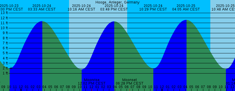 2025-10-23 06:07 PM CEST Moonset 2025-10-23 06:08 PM CEST Sunset 2025-10-23 10:00 PM CEST 2.00 feet Low Tide 2025-10-24 03:33 AM CEST 11.36 feet High Tide 2025-10-24 08:12 AM CEST Sunrise 2025-10-24 10:16 AM CEST 1.80 feet Low Tide 2025-10-24 12:02 PM CEST Moonrise 2025-10-24 03:49 PM CEST 11.33 feet High Tide 2025-10-24 06:06 PM CEST Sunset 2025-10-24 06:28 PM CEST Moonset 2025-10-24 10:29 PM CEST 1.98 feet Low Tide 2025-10-25 04:05 AM CEST 11.62 feet High Tide 2025-10-25 08:14 AM CEST Sunrise 2025-10-25 10:48 AM CEST 1.87 feet Low Tide 2025-10-25 01:14 PM CEST Moonrise 2025-10-25 04:26 PM CEST 11.41 feet High Tide 2025-10-25 06:04 PM CEST Sunset 2025-10-25 07:00 PM CEST Moonset 2025-10-25 11:01 PM CEST 2.34 feet Low Tide 2025-10-26 03:42 AM CET 11.73 feet High Tide 2025-10-26 07:16 AM CET Sunrise 2025-10-26 10:22 AM CET 2.35 feet Low Tide 2025-10-26 01:14 PM CET Moonrise 2025-10-26 04:04 PM CET 11.27 feet High Tide 2025-10-26 05:02 PM CET Sunset 2025-10-26 06:47 PM CET Moonset 2025-10-26 10:33 PM CET 3.09 feet Low Tide 2025-10-27 04:15 AM CET 11.65 feet High Tide 2025-10-27 07:18 AM CET Sunrise 2025-10-27 10:56 AM CET 3.13 feet Low Tide 2025-10-27 01:58 PM CET Moonrise 2025-10-27 04:37 PM CET 10.95 feet High Tide |