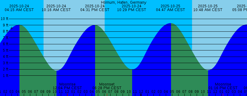 2025-10-24 04:15 AM CEST 9.07 feet High Tide 2025-10-24 08:13 AM CEST Sunrise 2025-10-24 10:16 AM CEST 1.80 feet Low Tide 2025-10-24 12:04 PM CEST Moonrise 2025-10-24 04:31 PM CEST 9.03 feet High Tide 2025-10-24 06:07 PM CEST Sunset 2025-10-24 06:28 PM CEST Moonset 2025-10-24 10:29 PM CEST 1.98 feet Low Tide 2025-10-25 04:47 AM CEST 9.32 feet High Tide 2025-10-25 08:15 AM CEST Sunrise 2025-10-25 10:48 AM CEST 1.87 feet Low Tide 2025-10-25 01:16 PM CEST Moonrise 2025-10-25 05:08 PM CEST 9.11 feet High Tide 2025-10-25 06:04 PM CEST Sunset 2025-10-25 06:59 PM CEST Moonset 2025-10-25 11:01 PM CEST 2.34 feet Low Tide 2025-10-26 04:24 AM CET 9.43 feet High Tide 2025-10-26 07:17 AM CET Sunrise 2025-10-26 10:22 AM CET 2.35 feet Low Tide 2025-10-26 01:17 PM CET Moonrise 2025-10-26 04:46 PM CET 8.98 feet High Tide 2025-10-26 05:02 PM CET Sunset 2025-10-26 06:46 PM CET Moonset 2025-10-26 10:33 PM CET 3.09 feet Low Tide 2025-10-27 04:57 AM CET 9.36 feet High Tide 2025-10-27 07:19 AM CET Sunrise 2025-10-27 10:56 AM CET 3.13 feet Low Tide 2025-10-27 02:01 PM CET Moonrise 2025-10-27 05:00 PM CET Sunset 2025-10-27 05:19 PM CET 8.65 feet High Tide 2025-10-27 07:50 PM CET Moonset |