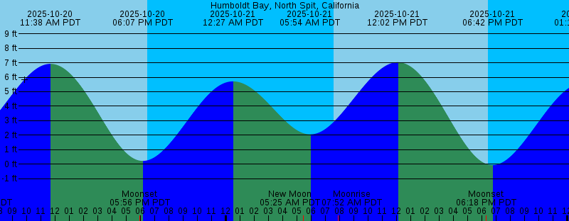 2025-10-20 06:50 AM PDT Moonrise 2025-10-20 07:34 AM PDT Sunrise 2025-10-20 11:38 AM PDT 6.92 feet High Tide 2025-10-20 05:56 PM PDT Moonset 2025-10-20 06:07 PM PDT 0.23 feet Low Tide 2025-10-20 06:28 PM PDT Sunset 2025-10-21 12:27 AM PDT 5.71 feet High Tide 2025-10-21 05:25 AM PDT New Moon 2025-10-21 05:54 AM PDT 2.06 feet Low Tide 2025-10-21 07:35 AM PDT Sunrise 2025-10-21 07:52 AM PDT Moonrise 2025-10-21 12:02 PM PDT 7.03 feet High Tide 2025-10-21 06:18 PM PDT Moonset 2025-10-21 06:26 PM PDT Sunset 2025-10-21 06:42 PM PDT -0.06 feet Low Tide 2025-10-22 01:10 AM PDT 5.62 feet High Tide 2025-10-22 06:24 AM PDT 2.51 feet Low Tide 2025-10-22 07:36 AM PDT Sunrise 2025-10-22 08:55 AM PDT Moonrise 2025-10-22 12:27 PM PDT 7.07 feet High Tide 2025-10-22 06:25 PM PDT Sunset 2025-10-22 06:44 PM PDT Moonset 2025-10-22 07:17 PM PDT -0.21 feet Low Tide 2025-10-23 01:52 AM PDT 5.51 feet High Tide 2025-10-23 06:54 AM PDT 2.93 feet Low Tide 2025-10-23 07:37 AM PDT Sunrise 2025-10-23 09:58 AM PDT Moonrise 2025-10-23 12:53 PM PDT 7.02 feet High Tide 2025-10-23 06:24 PM PDT Sunset 2025-10-23 07:14 PM PDT Moonset 2025-10-23 07:52 PM PDT -0.23 feet Low Tide 2025-10-24 02:35 AM PDT 5.35 feet High Tide |