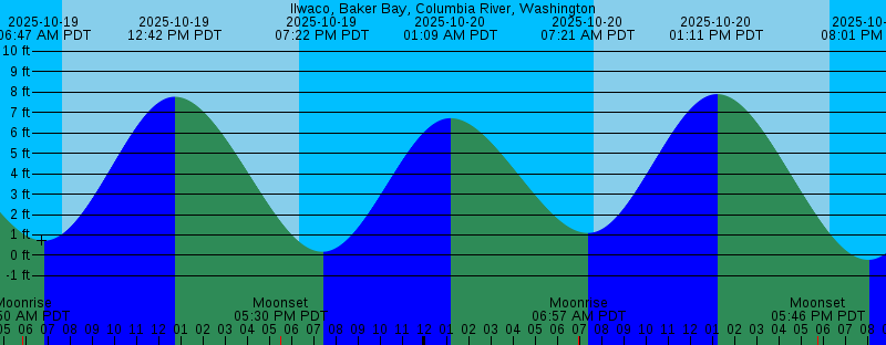 2025-10-19 05:50 AM PDT Moonrise 2025-10-19 06:47 AM PDT 0.72 feet Low Tide 2025-10-19 07:39 AM PDT Sunrise 2025-10-19 12:42 PM PDT 7.76 feet High Tide 2025-10-19 05:30 PM PDT Moonset 2025-10-19 06:21 PM PDT Sunset 2025-10-19 07:22 PM PDT 0.18 feet Low Tide 2025-10-20 01:09 AM PDT 6.72 feet High Tide 2025-10-20 06:57 AM PDT Moonrise 2025-10-20 07:21 AM PDT 1.10 feet Low Tide 2025-10-20 07:40 AM PDT Sunrise 2025-10-20 01:11 PM PDT 7.89 feet High Tide 2025-10-20 05:46 PM PDT Moonset 2025-10-20 06:19 PM PDT Sunset 2025-10-20 08:01 PM PDT -0.22 feet Low Tide 2025-10-21 01:51 AM PDT 6.66 feet High Tide 2025-10-21 05:25 AM PDT New Moon 2025-10-21 07:42 AM PDT Sunrise 2025-10-21 07:53 AM PDT 1.54 feet Low Tide 2025-10-21 08:03 AM PDT Moonrise 2025-10-21 01:37 PM PDT 7.92 feet High Tide 2025-10-21 06:04 PM PDT Moonset 2025-10-21 06:18 PM PDT Sunset 2025-10-21 08:37 PM PDT -0.45 feet Low Tide 2025-10-22 02:33 AM PDT 6.54 feet High Tide 2025-10-22 07:43 AM PDT Sunrise 2025-10-22 08:24 AM PDT 2.01 feet Low Tide 2025-10-22 09:11 AM PDT Moonrise 2025-10-22 02:01 PM PDT 7.89 feet High Tide 2025-10-22 06:16 PM PDT Sunset 2025-10-22 06:25 PM PDT Moonset 2025-10-22 09:11 PM PDT -0.53 feet Low Tide 2025-10-23 03:14 AM PDT 6.36 feet High Tide |