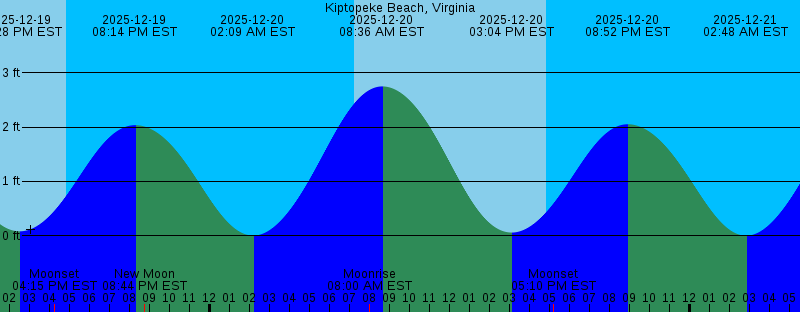 2025-12-19 02:28 PM EST 0.08 feet Low Tide 2025-12-19 04:15 PM EST Moonset 2025-12-19 04:49 PM EST Sunset 2025-12-19 08:14 PM EST 2.04 feet High Tide 2025-12-19 08:44 PM EST New Moon 2025-12-20 02:09 AM EST 0.01 feet Low Tide 2025-12-20 07:13 AM EST Sunrise 2025-12-20 08:00 AM EST Moonrise 2025-12-20 08:36 AM EST 2.75 feet High Tide 2025-12-20 03:04 PM EST 0.06 feet Low Tide 2025-12-20 04:49 PM EST Sunset 2025-12-20 05:10 PM EST Moonset 2025-12-20 08:52 PM EST 2.05 feet High Tide 2025-12-21 02:48 AM EST 0.00 feet Low Tide 2025-12-21 07:14 AM EST Sunrise 2025-12-21 08:46 AM EST Moonrise 2025-12-21 09:13 AM EST 2.73 feet High Tide 2025-12-21 03:40 PM EST 0.05 feet Low Tide 2025-12-21 04:50 PM EST Sunset 2025-12-21 06:10 PM EST Moonset 2025-12-21 09:30 PM EST 2.06 feet High Tide 2025-12-22 03:27 AM EST 0.02 feet Low Tide 2025-12-22 07:14 AM EST Sunrise 2025-12-22 09:24 AM EST Moonrise 2025-12-22 09:49 AM EST 2.70 feet High Tide 2025-12-22 04:17 PM EST 0.03 feet Low Tide 2025-12-22 04:50 PM EST Sunset 2025-12-22 07:14 PM EST Moonset 2025-12-22 10:09 PM EST 2.07 feet High Tide 2025-12-23 04:08 AM EST 0.04 feet Low Tide 2025-12-23 07:15 AM EST Sunrise 2025-12-23 09:57 AM EST Moonrise 2025-12-23 10:27 AM EST 2.65 feet High Tide |