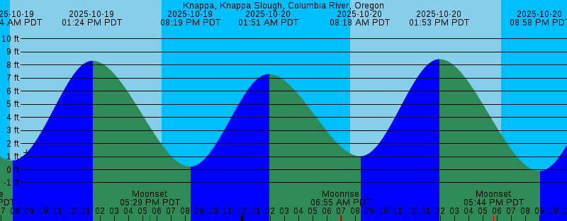 2025-10-19 07:37 AM PDT Sunrise 2025-10-19 07:44 AM PDT 0.70 feet Low Tide 2025-10-19 01:24 PM PDT 8.31 feet High Tide 2025-10-19 05:29 PM PDT Moonset 2025-10-19 06:20 PM PDT Sunset 2025-10-19 08:19 PM PDT 0.24 feet Low Tide 2025-10-20 01:51 AM PDT 7.29 feet High Tide 2025-10-20 06:55 AM PDT Moonrise 2025-10-20 07:38 AM PDT Sunrise 2025-10-20 08:18 AM PDT 1.03 feet Low Tide 2025-10-20 01:53 PM PDT 8.43 feet High Tide 2025-10-20 05:44 PM PDT Moonset 2025-10-20 06:18 PM PDT Sunset 2025-10-20 08:58 PM PDT -0.10 feet Low Tide 2025-10-21 02:33 AM PDT 7.23 feet High Tide 2025-10-21 05:25 AM PDT New Moon 2025-10-21 07:40 AM PDT Sunrise 2025-10-21 08:01 AM PDT Moonrise 2025-10-21 08:50 AM PDT 1.41 feet Low Tide 2025-10-21 02:19 PM PDT 8.46 feet High Tide 2025-10-21 06:02 PM PDT Moonset 2025-10-21 06:16 PM PDT Sunset 2025-10-21 09:34 PM PDT -0.30 feet Low Tide 2025-10-22 03:15 AM PDT 7.12 feet High Tide 2025-10-22 07:41 AM PDT Sunrise 2025-10-22 09:09 AM PDT Moonrise 2025-10-22 09:21 AM PDT 1.82 feet Low Tide 2025-10-22 02:43 PM PDT 8.43 feet High Tide 2025-10-22 06:14 PM PDT Sunset 2025-10-22 06:23 PM PDT Moonset 2025-10-22 10:08 PM PDT -0.37 feet Low Tide 2025-10-23 03:56 AM PDT 6.95 feet High Tide |