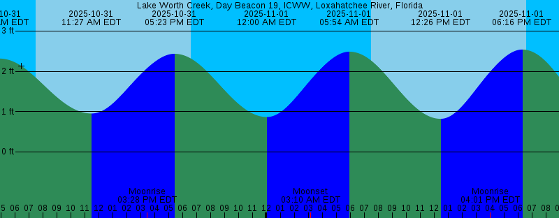 | 2025-10-31 02:09 AM EDT Moonset 2025-10-31 04:51 AM EDT 2.32 feet High Tide 2025-10-31 07:29 AM EDT Sunrise 2025-10-31 11:27 AM EDT 0.95 feet Low Tide 2025-10-31 03:28 PM EDT Moonrise 2025-10-31 05:23 PM EDT 2.43 feet High Tide 2025-10-31 06:37 PM EDT Sunset 2025-11-01 12:00 AM EDT 0.86 feet Low Tide 2025-11-01 03:10 AM EDT Moonset 2025-11-01 05:54 AM EDT 2.49 feet High Tide 2025-11-01 07:30 AM EDT Sunrise 2025-11-01 12:26 PM EDT 0.82 feet Low Tide 2025-11-01 04:01 PM EDT Moonrise 2025-11-01 06:16 PM EDT 2.54 feet High Tide 2025-11-01 06:37 PM EDT Sunset 2025-11-02 12:51 AM EDT 0.55 feet Low Tide 2025-11-02 03:12 AM EST Moonset 2025-11-02 05:52 AM EST 2.69 feet High Tide 2025-11-02 06:31 AM EST Sunrise 2025-11-02 12:20 PM EST 0.67 feet Low Tide 2025-11-02 03:35 PM EST Moonrise 2025-11-02 05:36 PM EST Sunset 2025-11-02 06:07 PM EST 2.65 feet High Tide 2025-11-03 12:40 AM EST 0.23 feet Low Tide 2025-11-03 04:16 AM EST Moonset 2025-11-03 06:31 AM EST Sunrise 2025-11-03 06:46 AM EST 2.89 feet High Tide 2025-11-03 01:10 PM EST 0.53 feet Low Tide 2025-11-03 04:10 PM EST Moonrise 2025-11-03 05:35 PM EST Sunset 2025-11-03 06:56 PM EST 2.76 feet High Tide | Other Nearby Tide Stations |