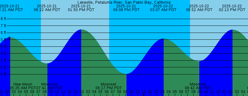 2025-10-20 05:53 PM PDT Moonset 2025-10-20 06:24 PM PDT Sunset 2025-10-20 08:34 PM PDT 0.24 feet Low Tide 2025-10-21 02:21 AM PDT 5.32 feet High Tide 2025-10-21 05:25 AM PDT New Moon 2025-10-21 07:25 AM PDT Sunrise 2025-10-21 07:41 AM PDT Moonrise 2025-10-21 08:22 AM PDT 1.57 feet Low Tide 2025-10-21 01:50 PM PDT 6.47 feet High Tide 2025-10-21 06:17 PM PDT Moonset 2025-10-21 06:23 PM PDT Sunset 2025-10-21 09:08 PM PDT 0.04 feet Low Tide 2025-10-22 03:07 AM PDT 5.15 feet High Tide 2025-10-22 07:26 AM PDT Sunrise 2025-10-22 08:42 AM PDT Moonrise 2025-10-22 08:52 AM PDT 1.89 feet Low Tide 2025-10-22 02:13 PM PDT 6.44 feet High Tide 2025-10-22 06:22 PM PDT Sunset 2025-10-22 06:44 PM PDT Moonset 2025-10-22 09:41 PM PDT -0.08 feet Low Tide 2025-10-23 03:53 AM PDT 4.99 feet High Tide 2025-10-23 07:27 AM PDT Sunrise 2025-10-23 09:23 AM PDT 2.20 feet Low Tide 2025-10-23 09:43 AM PDT Moonrise 2025-10-23 02:38 PM PDT 6.37 feet High Tide 2025-10-23 06:21 PM PDT Sunset 2025-10-23 07:16 PM PDT Moonset 2025-10-23 10:15 PM PDT -0.12 feet Low Tide 2025-10-24 04:41 AM PDT 4.82 feet High Tide 2025-10-24 07:28 AM PDT Sunrise 2025-10-24 09:55 AM PDT 2.47 feet Low Tide 2025-10-24 10:44 AM PDT Moonrise 2025-10-24 03:07 PM PDT 6.25 feet High Tide |