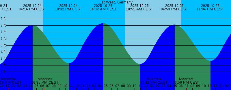 2025-10-24 04:00 AM CEST 8.08 feet High Tide 2025-10-24 08:14 AM CEST Sunrise 2025-10-24 10:19 AM CEST 2.13 feet Low Tide 2025-10-24 12:06 PM CEST Moonrise 2025-10-24 04:16 PM CEST 8.05 feet High Tide 2025-10-24 06:06 PM CEST Sunset 2025-10-24 06:25 PM CEST Moonset 2025-10-24 10:32 PM CEST 2.31 feet Low Tide 2025-10-25 04:32 AM CEST 8.34 feet High Tide 2025-10-25 08:16 AM CEST Sunrise 2025-10-25 10:51 AM CEST 2.20 feet Low Tide 2025-10-25 01:19 PM CEST Moonrise 2025-10-25 04:53 PM CEST 8.13 feet High Tide 2025-10-25 06:03 PM CEST Sunset 2025-10-25 06:56 PM CEST Moonset 2025-10-25 11:04 PM CEST 2.67 feet Low Tide 2025-10-26 04:09 AM CET 8.44 feet High Tide 2025-10-26 07:18 AM CET Sunrise 2025-10-26 10:25 AM CET 2.68 feet Low Tide 2025-10-26 01:19 PM CET Moonrise 2025-10-26 04:31 PM CET 7.99 feet High Tide 2025-10-26 05:01 PM CET Sunset 2025-10-26 06:43 PM CET Moonset 2025-10-26 10:36 PM CET 3.42 feet Low Tide 2025-10-27 04:42 AM CET 8.37 feet High Tide 2025-10-27 07:20 AM CET Sunrise 2025-10-27 10:59 AM CET 3.45 feet Low Tide 2025-10-27 02:03 PM CET Moonrise 2025-10-27 04:59 PM CET Sunset 2025-10-27 05:04 PM CET 7.67 feet High Tide 2025-10-27 07:47 PM CET Moonset 2025-10-27 11:04 PM CET 4.29 feet Low Tide |