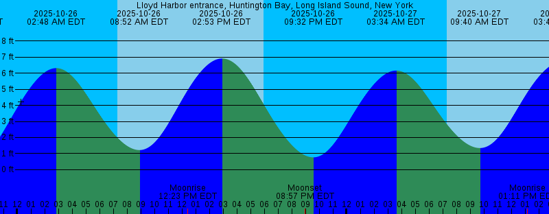 2025-10-25 02:10 PM EDT 7.15 feet High Tide 2025-10-25 05:58 PM EDT Sunset 2025-10-25 08:05 PM EDT Moonset 2025-10-25 08:47 PM EDT 0.60 feet Low Tide 2025-10-26 02:48 AM EDT 6.32 feet High Tide 2025-10-26 07:17 AM EDT Sunrise 2025-10-26 08:52 AM EDT 1.22 feet Low Tide 2025-10-26 12:23 PM EDT Moonrise 2025-10-26 02:53 PM EDT 6.92 feet High Tide 2025-10-26 05:56 PM EDT Sunset 2025-10-26 08:57 PM EDT Moonset 2025-10-26 09:32 PM EDT 0.76 feet Low Tide 2025-10-27 03:34 AM EDT 6.16 feet High Tide 2025-10-27 07:18 AM EDT Sunrise 2025-10-27 09:40 AM EDT 1.34 feet Low Tide 2025-10-27 01:11 PM EDT Moonrise 2025-10-27 03:41 PM EDT 6.72 feet High Tide 2025-10-27 05:55 PM EDT Sunset 2025-10-27 09:57 PM EDT Moonset 2025-10-27 10:23 PM EDT 0.88 feet Low Tide 2025-10-28 04:25 AM EDT 6.08 feet High Tide 2025-10-28 07:20 AM EDT Sunrise 2025-10-28 10:35 AM EDT 1.41 feet Low Tide 2025-10-28 01:51 PM EDT Moonrise 2025-10-28 04:36 PM EDT 6.60 feet High Tide 2025-10-28 05:54 PM EDT Sunset 2025-10-28 11:02 PM EDT Moonset 2025-10-28 11:18 PM EDT 0.92 feet Low Tide 2025-10-29 05:21 AM EDT 6.11 feet High Tide 2025-10-29 07:21 AM EDT Sunrise 2025-10-29 11:34 AM EDT 1.36 feet Low Tide 2025-10-29 12:22 PM EDT First Quarter |