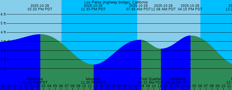 2025-10-28 07:08 AM PDT Sunrise 2025-10-28 01:30 PM PDT Moonrise 2025-10-28 02:20 PM PDT 3.80 feet High Tide 2025-10-28 06:03 PM PDT Sunset 2025-10-28 11:30 PM PDT Moonset 2025-10-28 11:33 PM PDT 0.45 feet Low Tide 2025-10-29 07:08 AM PDT Sunrise 2025-10-29 07:45 AM PDT 3.19 feet High Tide 2025-10-29 09:22 AM PDT First Quarter 2025-10-29 11:08 AM PDT 2.20 feet Low Tide 2025-10-29 02:08 PM PDT Moonrise 2025-10-29 04:15 PM PDT 3.66 feet High Tide 2025-10-29 06:02 PM PDT Sunset 2025-10-30 12:28 AM PDT 0.36 feet Low Tide 2025-10-30 12:34 AM PDT Moonset 2025-10-30 07:09 AM PDT Sunrise 2025-10-30 07:38 AM PDT 3.44 feet High Tide 2025-10-30 12:41 PM PDT 1.88 feet Low Tide 2025-10-30 02:40 PM PDT Moonrise 2025-10-30 05:47 PM PDT 3.72 feet High Tide 2025-10-30 06:01 PM PDT Sunset 2025-10-31 01:09 AM PDT 0.29 feet Low Tide 2025-10-31 01:38 AM PDT Moonset 2025-10-31 07:10 AM PDT Sunrise 2025-10-31 07:49 AM PDT 3.78 feet High Tide 2025-10-31 01:34 PM PDT 1.45 feet Low Tide 2025-10-31 03:10 PM PDT Moonrise 2025-10-31 06:00 PM PDT Sunset 2025-10-31 06:56 PM PDT 3.86 feet High Tide |