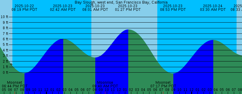 2025-10-22 01:02 PM PDT 7.83 feet High Tide 2025-10-22 06:21 PM PDT Sunset 2025-10-22 06:44 PM PDT Moonset 2025-10-22 08:19 PM PDT -0.10 feet Low Tide 2025-10-23 02:42 AM PDT 6.06 feet High Tide 2025-10-23 07:25 AM PDT Sunrise 2025-10-23 08:01 AM PDT 2.72 feet Low Tide 2025-10-23 09:40 AM PDT Moonrise 2025-10-23 01:27 PM PDT 7.75 feet High Tide 2025-10-23 06:20 PM PDT Sunset 2025-10-23 07:17 PM PDT Moonset 2025-10-23 08:53 PM PDT -0.15 feet Low Tide 2025-10-24 03:30 AM PDT 5.86 feet High Tide 2025-10-24 07:26 AM PDT Sunrise 2025-10-24 08:33 AM PDT 3.05 feet Low Tide 2025-10-24 10:40 AM PDT Moonrise 2025-10-24 01:56 PM PDT 7.60 feet High Tide 2025-10-24 06:19 PM PDT Sunset 2025-10-24 07:55 PM PDT Moonset 2025-10-24 09:31 PM PDT -0.11 feet Low Tide 2025-10-25 04:23 AM PDT 5.69 feet High Tide 2025-10-25 07:27 AM PDT Sunrise 2025-10-25 09:07 AM PDT 3.34 feet Low Tide 2025-10-25 11:38 AM PDT Moonrise 2025-10-25 02:30 PM PDT 7.39 feet High Tide 2025-10-25 06:18 PM PDT Sunset 2025-10-25 08:41 PM PDT Moonset 2025-10-25 10:13 PM PDT -0.01 feet Low Tide 2025-10-26 05:25 AM PDT 5.57 feet High Tide 2025-10-26 07:28 AM PDT Sunrise 2025-10-26 09:49 AM PDT 3.58 feet Low Tide |