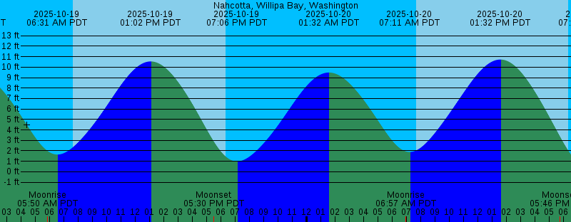 2025-10-19 05:50 AM PDT Moonrise 2025-10-19 06:31 AM PDT 1.64 feet Low Tide 2025-10-19 07:39 AM PDT Sunrise 2025-10-19 01:02 PM PDT 10.55 feet High Tide 2025-10-19 05:30 PM PDT Moonset 2025-10-19 06:21 PM PDT Sunset 2025-10-19 07:06 PM PDT 0.99 feet Low Tide 2025-10-20 01:32 AM PDT 9.49 feet High Tide 2025-10-20 06:57 AM PDT Moonrise 2025-10-20 07:11 AM PDT 1.89 feet Low Tide 2025-10-20 07:41 AM PDT Sunrise 2025-10-20 01:32 PM PDT 10.73 feet High Tide 2025-10-20 05:46 PM PDT Moonset 2025-10-20 06:19 PM PDT Sunset 2025-10-20 07:45 PM PDT 0.35 feet Low Tide 2025-10-21 02:13 AM PDT 9.45 feet High Tide 2025-10-21 05:25 AM PDT New Moon 2025-10-21 07:42 AM PDT Sunrise 2025-10-21 07:49 AM PDT 2.20 feet Low Tide 2025-10-21 08:04 AM PDT Moonrise 2025-10-21 02:00 PM PDT 10.77 feet High Tide 2025-10-21 06:03 PM PDT Moonset 2025-10-21 06:17 PM PDT Sunset 2025-10-21 08:23 PM PDT -0.08 feet Low Tide 2025-10-22 02:52 AM PDT 9.33 feet High Tide 2025-10-22 07:44 AM PDT Sunrise 2025-10-22 08:27 AM PDT 2.56 feet Low Tide 2025-10-22 09:12 AM PDT Moonrise 2025-10-22 02:27 PM PDT 10.71 feet High Tide 2025-10-22 06:16 PM PDT Sunset 2025-10-22 06:24 PM PDT Moonset 2025-10-22 09:00 PM PDT -0.30 feet Low Tide |