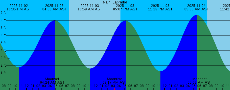 2025-11-02 02:48 AM AST Moonset 2025-11-02 04:08 AM AST 7.21 feet High Tide 2025-11-02 07:18 AM AST Sunrise 2025-11-02 10:14 AM AST 2.17 feet Low Tide 2025-11-02 03:11 PM AST Moonrise 2025-11-02 04:21 PM AST Sunset 2025-11-02 04:27 PM AST 7.55 feet High Tide 2025-11-02 10:35 PM AST 1.78 feet Low Tide 2025-11-03 04:24 AM AST Moonset 2025-11-03 04:50 AM AST 7.97 feet High Tide 2025-11-03 07:20 AM AST Sunrise 2025-11-03 10:59 AM AST 1.59 feet Low Tide 2025-11-03 03:17 PM AST Moonrise 2025-11-03 04:19 PM AST Sunset 2025-11-03 05:07 PM AST 7.95 feet High Tide 2025-11-03 11:13 PM AST 1.23 feet Low Tide 2025-11-04 05:30 AM AST 8.71 feet High Tide 2025-11-04 06:03 AM AST Moonset 2025-11-04 07:22 AM AST Sunrise 2025-11-04 11:42 AM AST 1.16 feet Low Tide 2025-11-04 03:25 PM AST Moonrise 2025-11-04 04:16 PM AST Sunset 2025-11-04 05:47 PM AST 8.30 feet High Tide 2025-11-04 11:51 PM AST 0.82 feet Low Tide 2025-11-05 06:11 AM AST 9.31 feet High Tide 2025-11-05 07:24 AM AST Sunrise 2025-11-05 07:49 AM AST Moonset 2025-11-05 09:20 AM AST Full Moon 2025-11-05 12:25 PM AST 0.91 feet Low Tide 2025-11-05 03:37 PM AST Moonrise 2025-11-05 04:14 PM AST Sunset 2025-11-05 06:28 PM AST 8.52 feet High Tide 2025-11-06 12:31 AM AST 0.63 feet Low Tide |