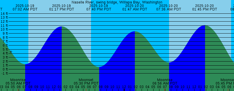 2025-10-19 05:50 AM PDT Moonrise 2025-10-19 07:02 AM PDT 1.31 feet Low Tide 2025-10-19 07:39 AM PDT Sunrise 2025-10-19 01:17 PM PDT 10.77 feet High Tide 2025-10-19 05:30 PM PDT Moonset 2025-10-19 06:20 PM PDT Sunset 2025-10-19 07:40 PM PDT 0.61 feet Low Tide 2025-10-20 01:47 AM PDT 9.56 feet High Tide 2025-10-20 06:56 AM PDT Moonrise 2025-10-20 07:36 AM PDT 1.74 feet Low Tide 2025-10-20 07:40 AM PDT Sunrise 2025-10-20 01:45 PM PDT 11.09 feet High Tide 2025-10-20 05:45 PM PDT Moonset 2025-10-20 06:19 PM PDT Sunset 2025-10-20 08:16 PM PDT 0.11 feet Low Tide 2025-10-21 02:28 AM PDT 9.56 feet High Tide 2025-10-21 05:25 AM PDT New Moon 2025-10-21 07:42 AM PDT Sunrise 2025-10-21 08:03 AM PDT Moonrise 2025-10-21 08:09 AM PDT 2.26 feet Low Tide 2025-10-21 02:11 PM PDT 11.27 feet High Tide 2025-10-21 06:03 PM PDT Moonset 2025-10-21 06:17 PM PDT Sunset 2025-10-21 08:49 PM PDT -0.20 feet Low Tide 2025-10-22 03:08 AM PDT 9.50 feet High Tide 2025-10-22 07:43 AM PDT Sunrise 2025-10-22 08:39 AM PDT 2.82 feet Low Tide 2025-10-22 09:11 AM PDT Moonrise 2025-10-22 02:38 PM PDT 11.31 feet High Tide 2025-10-22 06:15 PM PDT Sunset 2025-10-22 06:24 PM PDT Moonset 2025-10-22 09:22 PM PDT -0.31 feet Low Tide |