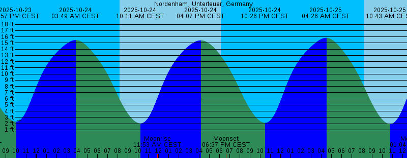 2025-10-23 06:11 PM CEST Sunset 2025-10-23 06:15 PM CEST Moonset 2025-10-23 09:57 PM CEST 2.31 feet Low Tide 2025-10-24 03:49 AM CEST 15.47 feet High Tide 2025-10-24 08:10 AM CEST Sunrise 2025-10-24 10:11 AM CEST 2.03 feet Low Tide 2025-10-24 11:53 AM CEST Moonrise 2025-10-24 04:07 PM CEST 15.42 feet High Tide 2025-10-24 06:09 PM CEST Sunset 2025-10-24 06:37 PM CEST Moonset 2025-10-24 10:26 PM CEST 2.12 feet Low Tide 2025-10-25 04:26 AM CEST 15.82 feet High Tide 2025-10-25 08:11 AM CEST Sunrise 2025-10-25 10:43 AM CEST 1.94 feet Low Tide 2025-10-25 01:04 PM CEST Moonrise 2025-10-25 04:45 PM CEST 15.54 feet High Tide 2025-10-25 06:07 PM CEST Sunset 2025-10-25 07:10 PM CEST Moonset 2025-10-25 10:57 PM CEST 2.44 feet Low Tide 2025-10-26 04:05 AM CET 15.83 feet High Tide 2025-10-26 07:13 AM CET Sunrise 2025-10-26 10:16 AM CET 2.46 feet Low Tide 2025-10-26 01:03 PM CET Moonrise 2025-10-26 04:22 PM CET 15.33 feet High Tide 2025-10-26 05:05 PM CET Sunset 2025-10-26 06:58 PM CET Moonset 2025-10-26 10:28 PM CET 3.30 feet Low Tide 2025-10-27 04:40 AM CET 15.55 feet High Tide 2025-10-27 07:15 AM CET Sunrise 2025-10-27 10:48 AM CET 3.37 feet Low Tide 2025-10-27 01:48 PM CET Moonrise |