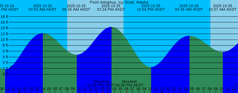 2025-10-24 12:49 PM AKDT Moonrise 2025-10-24 02:54 PM AKDT 15.10 feet High Tide 2025-10-24 05:32 PM AKDT Sunset 2025-10-24 05:36 PM AKDT Moonset 2025-10-24 09:30 PM AKDT -0.30 feet Low Tide 2025-10-25 03:53 AM AKDT 12.25 feet High Tide 2025-10-25 08:03 AM AKDT Sunrise 2025-10-25 09:34 AM AKDT 4.78 feet Low Tide 2025-10-25 02:04 PM AKDT Moonrise 2025-10-25 03:24 PM AKDT 14.42 feet High Tide 2025-10-25 05:30 PM AKDT Sunset 2025-10-25 06:06 PM AKDT Moonset 2025-10-25 10:04 PM AKDT 0.52 feet Low Tide 2025-10-26 04:30 AM AKDT 11.33 feet High Tide 2025-10-26 08:05 AM AKDT Sunrise 2025-10-26 10:07 AM AKDT 5.73 feet Low Tide 2025-10-26 02:58 PM AKDT Moonrise 2025-10-26 03:59 PM AKDT 13.56 feet High Tide 2025-10-26 05:27 PM AKDT Sunset 2025-10-26 07:00 PM AKDT Moonset 2025-10-26 10:43 PM AKDT 1.45 feet Low Tide 2025-10-27 05:16 AM AKDT 10.39 feet High Tide 2025-10-27 08:07 AM AKDT Sunrise 2025-10-27 10:48 AM AKDT 6.65 feet Low Tide 2025-10-27 03:29 PM AKDT Moonrise 2025-10-27 04:40 PM AKDT 12.57 feet High Tide 2025-10-27 05:25 PM AKDT Sunset 2025-10-27 08:17 PM AKDT Moonset 2025-10-27 11:32 PM AKDT 2.37 feet Low Tide 2025-10-28 06:21 AM AKDT 9.67 feet High Tide 2025-10-28 08:10 AM AKDT Sunrise |