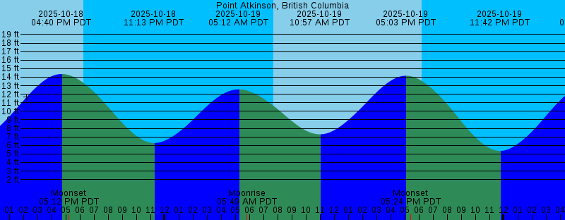 2025-10-18 07:39 AM PDT Sunrise 2025-10-18 10:11 AM PDT 6.41 feet Low Tide 2025-10-18 04:40 PM PDT 14.37 feet High Tide 2025-10-18 05:12 PM PDT Moonset 2025-10-18 06:15 PM PDT Sunset 2025-10-18 11:13 PM PDT 6.28 feet Low Tide 2025-10-19 05:12 AM PDT 12.57 feet High Tide 2025-10-19 05:49 AM PDT Moonrise 2025-10-19 07:41 AM PDT Sunrise 2025-10-19 10:57 AM PDT 7.30 feet Low Tide 2025-10-19 05:03 PM PDT 14.17 feet High Tide 2025-10-19 05:24 PM PDT Moonset 2025-10-19 06:13 PM PDT Sunset 2025-10-19 11:42 PM PDT 5.35 feet Low Tide 2025-10-20 06:03 AM PDT 13.16 feet High Tide 2025-10-20 06:58 AM PDT Moonrise 2025-10-20 07:42 AM PDT Sunrise 2025-10-20 11:39 AM PDT 8.22 feet Low Tide 2025-10-20 05:23 PM PDT 13.95 feet High Tide 2025-10-20 05:37 PM PDT Moonset 2025-10-20 06:11 PM PDT Sunset 2025-10-21 12:10 AM PDT 4.55 feet Low Tide 2025-10-21 05:25 AM PDT New Moon 2025-10-21 06:49 AM PDT 13.68 feet High Tide 2025-10-21 07:44 AM PDT Sunrise 2025-10-21 08:08 AM PDT Moonrise 2025-10-21 12:18 PM PDT 9.10 feet Low Tide 2025-10-21 05:42 PM PDT 13.73 feet High Tide 2025-10-21 05:52 PM PDT Moonset 2025-10-21 06:10 PM PDT Sunset 2025-10-22 12:37 AM PDT 3.89 feet Low Tide |