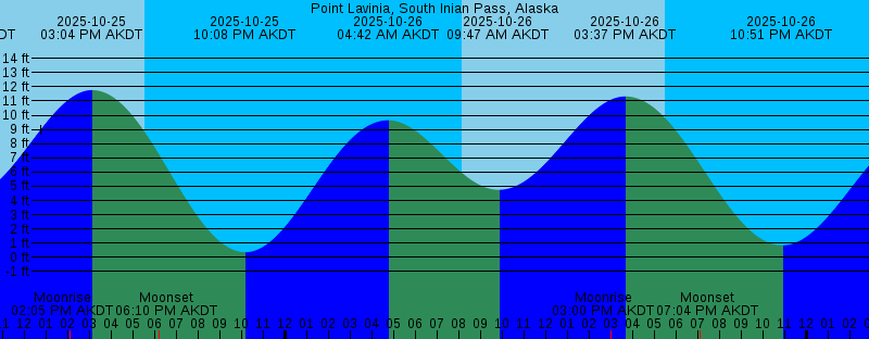 2025-10-25 03:59 AM AKDT 10.11 feet High Tide 2025-10-25 08:05 AM AKDT Sunrise 2025-10-25 09:14 AM AKDT 4.27 feet Low Tide 2025-10-25 02:06 PM AKDT Moonrise 2025-10-25 03:04 PM AKDT 11.76 feet High Tide 2025-10-25 05:32 PM AKDT Sunset 2025-10-25 06:10 PM AKDT Moonset 2025-10-25 10:08 PM AKDT 0.37 feet Low Tide 2025-10-26 04:42 AM AKDT 9.64 feet High Tide 2025-10-26 08:07 AM AKDT Sunrise 2025-10-26 09:47 AM AKDT 4.75 feet Low Tide 2025-10-26 03:00 PM AKDT Moonrise 2025-10-26 03:37 PM AKDT 11.32 feet High Tide 2025-10-26 05:30 PM AKDT Sunset 2025-10-26 07:04 PM AKDT Moonset 2025-10-26 10:51 PM AKDT 0.85 feet Low Tide 2025-10-27 05:35 AM AKDT 9.19 feet High Tide 2025-10-27 08:09 AM AKDT Sunrise 2025-10-27 10:27 AM AKDT 5.19 feet Low Tide 2025-10-27 03:31 PM AKDT Moonrise 2025-10-27 04:16 PM AKDT 10.79 feet High Tide 2025-10-27 05:27 PM AKDT Sunset 2025-10-27 08:21 PM AKDT Moonset 2025-10-27 11:43 PM AKDT 1.30 feet Low Tide 2025-10-28 06:43 AM AKDT 8.90 feet High Tide 2025-10-28 08:12 AM AKDT Sunrise 2025-10-28 11:25 AM AKDT 5.53 feet Low Tide 2025-10-28 03:47 PM AKDT Moonrise 2025-10-28 05:09 PM AKDT 10.19 feet High Tide 2025-10-28 05:25 PM AKDT Sunset 2025-10-28 09:50 PM AKDT Moonset 2025-10-29 12:47 AM AKDT 1.61 feet Low Tide |