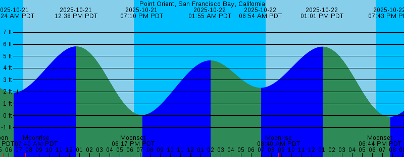 2025-10-21 01:09 AM PDT 4.79 feet High Tide 2025-10-21 05:25 AM PDT New Moon 2025-10-21 06:24 AM PDT 1.93 feet Low Tide 2025-10-21 07:24 AM PDT Sunrise 2025-10-21 07:40 AM PDT Moonrise 2025-10-21 12:38 PM PDT 5.83 feet High Tide 2025-10-21 06:17 PM PDT Moonset 2025-10-21 06:23 PM PDT Sunset 2025-10-21 07:10 PM PDT 0.05 feet Low Tide 2025-10-22 01:55 AM PDT 4.64 feet High Tide 2025-10-22 06:54 AM PDT 2.34 feet Low Tide 2025-10-22 07:25 AM PDT Sunrise 2025-10-22 08:40 AM PDT Moonrise 2025-10-22 01:01 PM PDT 5.80 feet High Tide 2025-10-22 06:22 PM PDT Sunset 2025-10-22 06:44 PM PDT Moonset 2025-10-22 07:43 PM PDT -0.10 feet Low Tide 2025-10-23 02:41 AM PDT 4.49 feet High Tide 2025-10-23 07:25 AM PDT 2.72 feet Low Tide 2025-10-23 07:26 AM PDT Sunrise 2025-10-23 09:42 AM PDT Moonrise 2025-10-23 01:26 PM PDT 5.74 feet High Tide 2025-10-23 06:20 PM PDT Sunset 2025-10-23 07:16 PM PDT Moonset 2025-10-23 08:17 PM PDT -0.15 feet Low Tide 2025-10-24 03:29 AM PDT 4.34 feet High Tide 2025-10-24 07:27 AM PDT Sunrise 2025-10-24 07:57 AM PDT 3.05 feet Low Tide 2025-10-24 10:42 AM PDT Moonrise 2025-10-24 01:55 PM PDT 5.63 feet High Tide 2025-10-24 06:19 PM PDT Sunset 2025-10-24 07:55 PM PDT Moonset 2025-10-24 08:55 PM PDT -0.11 feet Low Tide |
