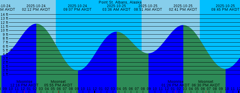 2025-10-24 02:57 AM AKDT 10.10 feet High Tide 2025-10-24 07:47 AM AKDT Sunrise 2025-10-24 08:21 AM AKDT 3.75 feet Low Tide 2025-10-24 12:16 PM AKDT Moonrise 2025-10-24 02:12 PM AKDT 11.71 feet High Tide 2025-10-24 05:31 PM AKDT Sunset 2025-10-24 05:55 PM AKDT Moonset 2025-10-24 09:07 PM AKDT -0.06 feet Low Tide 2025-10-25 03:36 AM AKDT 9.71 feet High Tide 2025-10-25 07:49 AM AKDT Sunrise 2025-10-25 08:51 AM AKDT 4.27 feet Low Tide 2025-10-25 01:26 PM AKDT Moonrise 2025-10-25 02:41 PM AKDT 11.36 feet High Tide 2025-10-25 05:29 PM AKDT Sunset 2025-10-25 06:30 PM AKDT Moonset 2025-10-25 09:45 PM AKDT 0.37 feet Low Tide 2025-10-26 04:19 AM AKDT 9.24 feet High Tide 2025-10-26 07:51 AM AKDT Sunrise 2025-10-26 09:24 AM AKDT 4.75 feet Low Tide 2025-10-26 02:20 PM AKDT Moonrise 2025-10-26 03:14 PM AKDT 10.92 feet High Tide 2025-10-26 05:27 PM AKDT Sunset 2025-10-26 07:23 PM AKDT Moonset 2025-10-26 10:28 PM AKDT 0.85 feet Low Tide 2025-10-27 05:12 AM AKDT 8.79 feet High Tide 2025-10-27 07:53 AM AKDT Sunrise 2025-10-27 10:04 AM AKDT 5.19 feet Low Tide 2025-10-27 02:56 PM AKDT Moonrise 2025-10-27 03:53 PM AKDT 10.39 feet High Tide 2025-10-27 05:24 PM AKDT Sunset 2025-10-27 08:35 PM AKDT Moonset |