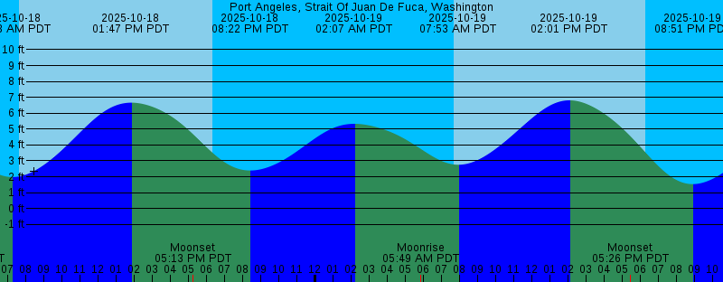 2025-10-18 12:57 AM PDT 5.22 feet High Tide 2025-10-18 04:40 AM PDT Moonrise 2025-10-18 07:13 AM PDT 1.98 feet Low Tide 2025-10-18 07:38 AM PDT Sunrise 2025-10-18 01:47 PM PDT 6.66 feet High Tide 2025-10-18 05:13 PM PDT Moonset 2025-10-18 06:18 PM PDT Sunset 2025-10-18 08:22 PM PDT 2.39 feet Low Tide 2025-10-19 02:07 AM PDT 5.33 feet High Tide 2025-10-19 05:49 AM PDT Moonrise 2025-10-19 07:39 AM PDT Sunrise 2025-10-19 07:53 AM PDT 2.75 feet Low Tide 2025-10-19 02:01 PM PDT 6.81 feet High Tide 2025-10-19 05:26 PM PDT Moonset 2025-10-19 06:16 PM PDT Sunset 2025-10-19 08:51 PM PDT 1.53 feet Low Tide 2025-10-20 03:09 AM PDT 5.53 feet High Tide 2025-10-20 06:57 AM PDT Moonrise 2025-10-20 07:41 AM PDT Sunrise 2025-10-20 08:30 AM PDT 3.54 feet Low Tide 2025-10-20 02:20 PM PDT 6.96 feet High Tide 2025-10-20 05:40 PM PDT Moonset 2025-10-20 06:14 PM PDT Sunset 2025-10-20 09:21 PM PDT 0.78 feet Low Tide 2025-10-21 04:05 AM PDT 5.77 feet High Tide 2025-10-21 05:25 AM PDT New Moon 2025-10-21 07:43 AM PDT Sunrise 2025-10-21 08:05 AM PDT Moonrise 2025-10-21 09:04 AM PDT 4.29 feet Low Tide 2025-10-21 02:39 PM PDT 7.05 feet High Tide 2025-10-21 05:56 PM PDT Moonset 2025-10-21 06:12 PM PDT Sunset 2025-10-21 09:52 PM PDT 0.18 feet Low Tide |