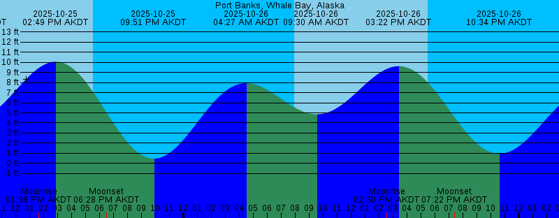 2025-10-25 03:44 AM AKDT 8.41 feet High Tide 2025-10-25 07:54 AM AKDT Sunrise 2025-10-25 08:57 AM AKDT 4.37 feet Low Tide 2025-10-25 01:36 PM AKDT Moonrise 2025-10-25 02:49 PM AKDT 10.06 feet High Tide 2025-10-25 05:32 PM AKDT Sunset 2025-10-25 06:28 PM AKDT Moonset 2025-10-25 09:51 PM AKDT 0.47 feet Low Tide 2025-10-26 04:27 AM AKDT 7.94 feet High Tide 2025-10-26 07:56 AM AKDT Sunrise 2025-10-26 09:30 AM AKDT 4.85 feet Low Tide 2025-10-26 02:30 PM AKDT Moonrise 2025-10-26 03:22 PM AKDT 9.62 feet High Tide 2025-10-26 05:29 PM AKDT Sunset 2025-10-26 07:22 PM AKDT Moonset 2025-10-26 10:34 PM AKDT 0.95 feet Low Tide 2025-10-27 05:20 AM AKDT 7.49 feet High Tide 2025-10-27 07:59 AM AKDT Sunrise 2025-10-27 10:10 AM AKDT 5.29 feet Low Tide 2025-10-27 03:05 PM AKDT Moonrise 2025-10-27 04:01 PM AKDT 9.09 feet High Tide 2025-10-27 05:27 PM AKDT Sunset 2025-10-27 08:35 PM AKDT Moonset 2025-10-27 11:26 PM AKDT 1.40 feet Low Tide 2025-10-28 06:28 AM AKDT 7.20 feet High Tide 2025-10-28 08:01 AM AKDT Sunrise 2025-10-28 11:08 AM AKDT 5.63 feet Low Tide 2025-10-28 03:27 PM AKDT Moonrise 2025-10-28 04:54 PM AKDT 8.49 feet High Tide 2025-10-28 05:25 PM AKDT Sunset 2025-10-28 09:59 PM AKDT Moonset 2025-10-29 12:30 AM AKDT 1.71 feet Low Tide |