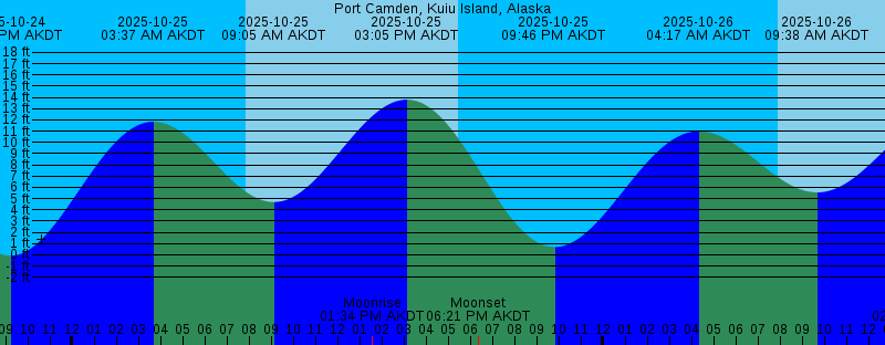 2025-10-24 12:22 PM AKDT Moonrise 2025-10-24 02:35 PM AKDT 14.43 feet High Tide 2025-10-24 05:29 PM AKDT Sunset 2025-10-24 05:48 PM AKDT Moonset 2025-10-24 09:10 PM AKDT -0.09 feet Low Tide 2025-10-25 03:37 AM AKDT 11.83 feet High Tide 2025-10-25 07:50 AM AKDT Sunrise 2025-10-25 09:05 AM AKDT 4.69 feet Low Tide 2025-10-25 01:34 PM AKDT Moonrise 2025-10-25 03:05 PM AKDT 13.79 feet High Tide 2025-10-25 05:27 PM AKDT Sunset 2025-10-25 06:21 PM AKDT Moonset 2025-10-25 09:46 PM AKDT 0.68 feet Low Tide 2025-10-26 04:17 AM AKDT 10.98 feet High Tide 2025-10-26 07:53 AM AKDT Sunrise 2025-10-26 09:38 AM AKDT 5.55 feet Low Tide 2025-10-26 02:28 PM AKDT Moonrise 2025-10-26 03:39 PM AKDT 12.99 feet High Tide 2025-10-26 05:25 PM AKDT Sunset 2025-10-26 07:15 PM AKDT Moonset 2025-10-26 10:27 PM AKDT 1.56 feet Low Tide 2025-10-27 05:05 AM AKDT 10.13 feet High Tide 2025-10-27 07:55 AM AKDT Sunrise 2025-10-27 10:19 AM AKDT 6.38 feet Low Tide 2025-10-27 03:03 PM AKDT Moonrise 2025-10-27 04:21 PM AKDT 12.08 feet High Tide 2025-10-27 05:22 PM AKDT Sunset 2025-10-27 08:28 PM AKDT Moonset 2025-10-27 11:18 PM AKDT 2.40 feet Low Tide 2025-10-28 06:07 AM AKDT 9.50 feet High Tide 2025-10-28 07:57 AM AKDT Sunrise |