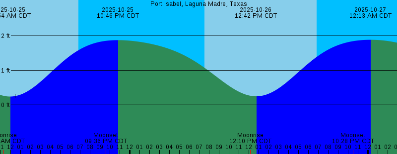 2025-10-25 07:33 AM CDT Sunrise 2025-10-25 11:16 AM CDT Moonrise 2025-10-25 11:54 AM CDT 0.25 feet Low Tide 2025-10-25 06:51 PM CDT Sunset 2025-10-25 09:36 PM CDT Moonset 2025-10-25 10:46 PM CDT 1.88 feet High Tide 2025-10-26 07:34 AM CDT Sunrise 2025-10-26 12:10 PM CDT Moonrise 2025-10-26 12:42 PM CDT 0.25 feet Low Tide 2025-10-26 06:51 PM CDT Sunset 2025-10-26 10:28 PM CDT Moonset 2025-10-27 12:13 AM CDT 1.89 feet High Tide 2025-10-27 07:34 AM CDT Sunrise 2025-10-27 12:59 PM CDT Moonrise 2025-10-27 01:36 PM CDT 0.27 feet Low Tide 2025-10-27 06:50 PM CDT Sunset 2025-10-27 11:24 PM CDT Moonset 2025-10-28 01:14 AM CDT 1.89 feet High Tide 2025-10-28 07:35 AM CDT Sunrise 2025-10-28 01:44 PM CDT Moonrise 2025-10-28 02:35 PM CDT 0.31 feet Low Tide 2025-10-28 06:49 PM CDT Sunset 2025-10-29 12:23 AM CDT Moonset |