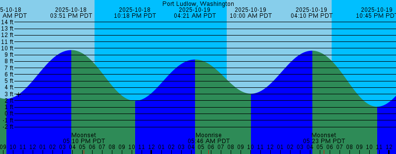 2025-10-18 09:15 AM PDT 2.28 feet Low Tide 2025-10-18 03:51 PM PDT 9.72 feet High Tide 2025-10-18 05:10 PM PDT Moonset 2025-10-18 06:15 PM PDT Sunset 2025-10-18 10:18 PM PDT 1.97 feet Low Tide 2025-10-19 04:21 AM PDT 8.28 feet High Tide 2025-10-19 05:46 AM PDT Moonrise 2025-10-19 07:36 AM PDT Sunrise 2025-10-19 10:00 AM PDT 3.06 feet Low Tide 2025-10-19 04:10 PM PDT 9.63 feet High Tide 2025-10-19 05:23 PM PDT Moonset 2025-10-19 06:13 PM PDT Sunset 2025-10-19 10:45 PM PDT 1.08 feet Low Tide 2025-10-20 05:10 AM PDT 8.69 feet High Tide 2025-10-20 06:54 AM PDT Moonrise 2025-10-20 07:38 AM PDT Sunrise 2025-10-20 10:41 AM PDT 3.94 feet Low Tide 2025-10-20 04:28 PM PDT 9.51 feet High Tide 2025-10-20 05:38 PM PDT Moonset 2025-10-20 06:12 PM PDT Sunset 2025-10-20 11:10 PM PDT 0.32 feet Low Tide 2025-10-21 05:25 AM PDT New Moon 2025-10-21 05:53 AM PDT 9.06 feet High Tide 2025-10-21 07:39 AM PDT Sunrise 2025-10-21 08:02 AM PDT Moonrise 2025-10-21 11:19 AM PDT 4.84 feet Low Tide 2025-10-21 04:48 PM PDT 9.35 feet High Tide 2025-10-21 05:54 PM PDT Moonset 2025-10-21 06:10 PM PDT Sunset 2025-10-21 11:36 PM PDT -0.29 feet Low Tide 2025-10-22 06:33 AM PDT 9.36 feet High Tide 2025-10-22 07:41 AM PDT Sunrise |