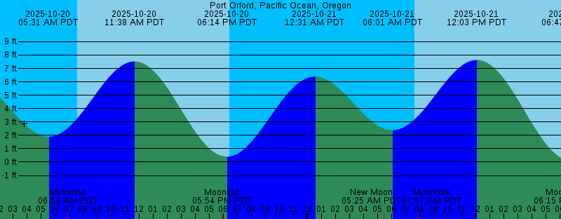 2025-10-20 05:31 AM PDT 1.91 feet Low Tide 2025-10-20 06:54 AM PDT Moonrise 2025-10-20 07:37 AM PDT Sunrise 2025-10-20 11:38 AM PDT 7.52 feet High Tide 2025-10-20 05:54 PM PDT Moonset 2025-10-20 06:14 PM PDT 0.41 feet Low Tide 2025-10-20 06:26 PM PDT Sunset 2025-10-21 12:31 AM PDT 6.39 feet High Tide 2025-10-21 05:25 AM PDT New Moon 2025-10-21 06:01 AM PDT 2.39 feet Low Tide 2025-10-21 07:38 AM PDT Sunrise 2025-10-21 07:57 AM PDT Moonrise 2025-10-21 12:03 PM PDT 7.63 feet High Tide 2025-10-21 06:15 PM PDT Moonset 2025-10-21 06:25 PM PDT Sunset 2025-10-21 06:47 PM PDT 0.11 feet Low Tide 2025-10-22 01:13 AM PDT 6.34 feet High Tide 2025-10-22 06:31 AM PDT 2.85 feet Low Tide 2025-10-22 07:40 AM PDT Sunrise 2025-10-22 09:02 AM PDT Moonrise 2025-10-22 12:28 PM PDT 7.66 feet High Tide 2025-10-22 06:23 PM PDT Sunset 2025-10-22 06:39 PM PDT Moonset 2025-10-22 07:20 PM PDT -0.03 feet Low Tide 2025-10-23 01:53 AM PDT 6.24 feet High Tide 2025-10-23 07:01 AM PDT 3.28 feet Low Tide 2025-10-23 07:41 AM PDT Sunrise 2025-10-23 10:06 AM PDT Moonrise 2025-10-23 12:53 PM PDT 7.60 feet High Tide 2025-10-23 06:22 PM PDT Sunset 2025-10-23 07:08 PM PDT Moonset 2025-10-23 07:54 PM PDT -0.04 feet Low Tide |
