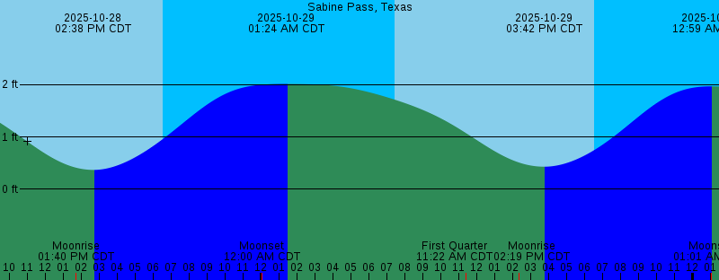 2025-10-28 02:06 AM CDT 2.03 feet High Tide 2025-10-28 07:26 AM CDT Sunrise 2025-10-28 01:40 PM CDT Moonrise 2025-10-28 02:38 PM CDT 0.37 feet Low Tide 2025-10-28 06:31 PM CDT Sunset 2025-10-29 12:00 AM CDT Moonset 2025-10-29 01:24 AM CDT 2.01 feet High Tide 2025-10-29 07:27 AM CDT Sunrise 2025-10-29 11:22 AM CDT First Quarter 2025-10-29 02:19 PM CDT Moonrise 2025-10-29 03:42 PM CDT 0.43 feet Low Tide 2025-10-29 06:30 PM CDT Sunset 2025-10-30 12:59 AM CDT 1.97 feet High Tide 2025-10-30 01:01 AM CDT Moonset 2025-10-30 07:27 AM CDT Sunrise 2025-10-30 02:55 PM CDT Moonrise 2025-10-30 04:50 PM CDT 0.52 feet Low Tide 2025-10-30 06:30 PM CDT Sunset 2025-10-31 12:59 AM CDT 1.89 feet High Tide 2025-10-31 02:03 AM CDT Moonset 2025-10-31 07:28 AM CDT Sunrise 2025-10-31 03:27 PM CDT Moonrise 2025-10-31 05:56 PM CDT 0.66 feet Low Tide 2025-10-31 06:29 PM CDT Sunset |