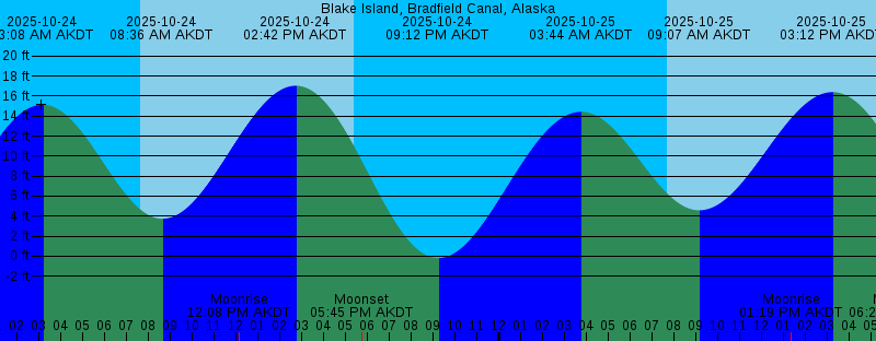 2025-10-24 03:08 AM AKDT 15.14 feet High Tide 2025-10-24 07:39 AM AKDT Sunrise 2025-10-24 08:36 AM AKDT 3.74 feet Low Tide 2025-10-24 12:08 PM AKDT Moonrise 2025-10-24 02:42 PM AKDT 17.03 feet High Tide 2025-10-24 05:23 PM AKDT Sunset 2025-10-24 05:45 PM AKDT Moonset 2025-10-24 09:12 PM AKDT -0.19 feet Low Tide 2025-10-25 03:44 AM AKDT 14.43 feet High Tide 2025-10-25 07:41 AM AKDT Sunrise 2025-10-25 09:07 AM AKDT 4.59 feet Low Tide 2025-10-25 01:19 PM AKDT Moonrise 2025-10-25 03:12 PM AKDT 16.39 feet High Tide 2025-10-25 05:20 PM AKDT Sunset 2025-10-25 06:20 PM AKDT Moonset 2025-10-25 09:48 PM AKDT 0.58 feet Low Tide 2025-10-26 04:24 AM AKDT 13.58 feet High Tide 2025-10-26 07:43 AM AKDT Sunrise 2025-10-26 09:40 AM AKDT 5.45 feet Low Tide 2025-10-26 02:13 PM AKDT Moonrise 2025-10-26 03:46 PM AKDT 15.59 feet High Tide 2025-10-26 05:18 PM AKDT Sunset 2025-10-26 07:13 PM AKDT Moonset 2025-10-26 10:29 PM AKDT 1.46 feet Low Tide 2025-10-27 05:12 AM AKDT 12.73 feet High Tide 2025-10-27 07:45 AM AKDT Sunrise 2025-10-27 10:21 AM AKDT 6.28 feet Low Tide 2025-10-27 02:49 PM AKDT Moonrise 2025-10-27 04:28 PM AKDT 14.68 feet High Tide 2025-10-27 05:16 PM AKDT Sunset 2025-10-27 08:25 PM AKDT Moonset 2025-10-27 11:20 PM AKDT 2.30 feet Low Tide |