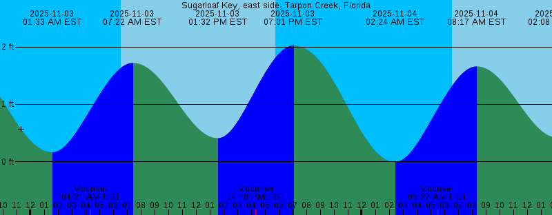 2025-11-02 12:57 PM EST 0.39 feet Low Tide 2025-11-02 03:41 PM EST Moonrise 2025-11-02 05:44 PM EST Sunset 2025-11-02 06:28 PM EST 1.84 feet High Tide 2025-11-03 01:33 AM EST 0.17 feet Low Tide 2025-11-03 04:21 AM EST Moonset 2025-11-03 06:34 AM EST Sunrise 2025-11-03 07:22 AM EST 1.72 feet High Tide 2025-11-03 01:32 PM EST 0.41 feet Low Tide 2025-11-03 04:18 PM EST Moonrise 2025-11-03 05:44 PM EST Sunset 2025-11-03 07:01 PM EST 2.02 feet High Tide 2025-11-04 02:24 AM EST -0.00 feet Low Tide 2025-11-04 05:27 AM EST Moonset 2025-11-04 06:35 AM EST Sunrise 2025-11-04 08:17 AM EST 1.66 feet High Tide 2025-11-04 02:08 PM EST 0.42 feet Low Tide 2025-11-04 04:58 PM EST Moonrise 2025-11-04 05:43 PM EST Sunset 2025-11-04 07:37 PM EST 2.19 feet High Tide 2025-11-05 03:14 AM EST -0.13 feet Low Tide 2025-11-05 06:35 AM EST Sunrise 2025-11-05 06:36 AM EST Moonset 2025-11-05 08:20 AM EST Full Moon 2025-11-05 09:10 AM EST 1.56 feet High Tide 2025-11-05 02:45 PM EST 0.43 feet Low Tide 2025-11-05 05:43 PM EST Sunset 2025-11-05 05:45 PM EST Moonrise 2025-11-05 08:16 PM EST 2.31 feet High Tide 2025-11-06 04:05 AM EST -0.20 feet Low Tide 2025-11-06 06:36 AM EST Sunrise 2025-11-06 07:49 AM EST Moonset 2025-11-06 10:01 AM EST 1.43 feet High Tide |