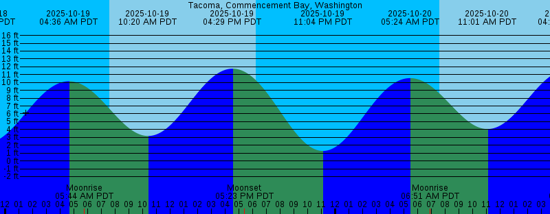 2025-10-18 06:15 PM PDT Sunset 2025-10-18 10:35 PM PDT 2.28 feet Low Tide 2025-10-19 04:36 AM PDT 10.15 feet High Tide 2025-10-19 05:44 AM PDT Moonrise 2025-10-19 07:34 AM PDT Sunrise 2025-10-19 10:20 AM PDT 3.18 feet Low Tide 2025-10-19 04:29 PM PDT 11.76 feet High Tide 2025-10-19 05:23 PM PDT Moonset 2025-10-19 06:13 PM PDT Sunset 2025-10-19 11:04 PM PDT 1.27 feet Low Tide 2025-10-20 05:24 AM PDT 10.55 feet High Tide 2025-10-20 06:51 AM PDT Moonrise 2025-10-20 07:35 AM PDT Sunrise 2025-10-20 11:01 AM PDT 4.06 feet Low Tide 2025-10-20 04:49 PM PDT 11.59 feet High Tide 2025-10-20 05:38 PM PDT Moonset 2025-10-20 06:12 PM PDT Sunset 2025-10-20 11:30 PM PDT 0.41 feet Low Tide 2025-10-21 05:25 AM PDT New Moon 2025-10-21 06:08 AM PDT 10.89 feet High Tide 2025-10-21 07:37 AM PDT Sunrise 2025-10-21 07:59 AM PDT Moonrise 2025-10-21 11:40 AM PDT 4.97 feet Low Tide 2025-10-21 05:09 PM PDT 11.34 feet High Tide 2025-10-21 05:55 PM PDT Moonset 2025-10-21 06:10 PM PDT Sunset 2025-10-21 11:55 PM PDT -0.27 feet Low Tide 2025-10-22 06:49 AM PDT 11.17 feet High Tide 2025-10-22 07:38 AM PDT Sunrise 2025-10-22 09:07 AM PDT Moonrise 2025-10-22 12:18 PM PDT 5.82 feet Low Tide 2025-10-22 05:32 PM PDT 11.02 feet High Tide |