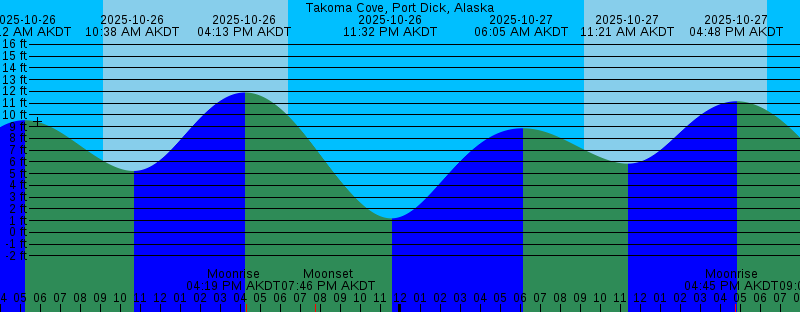 2025-10-26 05:12 AM AKDT 9.54 feet High Tide 2025-10-26 09:09 AM AKDT Sunrise 2025-10-26 10:38 AM AKDT 5.22 feet Low Tide 2025-10-26 04:13 PM AKDT 11.91 feet High Tide 2025-10-26 04:19 PM AKDT Moonrise 2025-10-26 06:24 PM AKDT Sunset 2025-10-26 07:46 PM AKDT Moonset 2025-10-26 11:32 PM AKDT 1.18 feet Low Tide 2025-10-27 06:05 AM AKDT 8.86 feet High Tide 2025-10-27 09:12 AM AKDT Sunrise 2025-10-27 11:21 AM AKDT 5.85 feet Low Tide 2025-10-27 04:45 PM AKDT Moonrise 2025-10-27 04:48 PM AKDT 11.16 feet High Tide 2025-10-27 06:22 PM AKDT Sunset 2025-10-27 09:08 PM AKDT Moonset 2025-10-28 12:22 AM AKDT 1.80 feet Low Tide 2025-10-28 07:26 AM AKDT 8.44 feet High Tide 2025-10-28 09:14 AM AKDT Sunrise 2025-10-28 12:16 PM AKDT 6.32 feet Low Tide 2025-10-28 04:57 PM AKDT Moonrise 2025-10-28 05:39 PM AKDT 10.28 feet High Tide 2025-10-28 06:19 PM AKDT Sunset 2025-10-28 10:42 PM AKDT Moonset 2025-10-29 01:19 AM AKDT 2.25 feet Low Tide 2025-10-29 08:22 AM AKDT First Quarter 2025-10-29 08:50 AM AKDT 8.62 feet High Tide 2025-10-29 09:16 AM AKDT Sunrise 2025-10-29 01:27 PM AKDT 6.47 feet Low Tide 2025-10-29 05:02 PM AKDT Moonrise 2025-10-29 06:17 PM AKDT Sunset 2025-10-29 07:19 PM AKDT 9.54 feet High Tide 2025-10-30 12:19 AM AKDT Moonset 2025-10-30 02:26 AM AKDT 2.43 feet Low Tide |