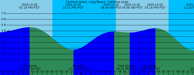 2025-10-28 07:08 AM PDT Sunrise 2025-10-28 01:19 PM PDT 4.63 feet High Tide 2025-10-28 01:31 PM PDT Moonrise 2025-10-28 06:03 PM PDT Sunset 2025-10-28 10:21 PM PDT 0.76 feet Low Tide 2025-10-28 11:31 PM PDT Moonset 2025-10-29 06:44 AM PDT 3.89 feet High Tide 2025-10-29 07:09 AM PDT Sunrise 2025-10-29 09:22 AM PDT First Quarter 2025-10-29 09:56 AM PDT 3.71 feet Low Tide 2025-10-29 02:08 PM PDT Moonrise 2025-10-29 03:14 PM PDT 4.46 feet High Tide 2025-10-29 06:02 PM PDT Sunset 2025-10-29 11:16 PM PDT 0.61 feet Low Tide 2025-10-30 12:34 AM PDT Moonset 2025-10-30 06:37 AM PDT 4.19 feet High Tide 2025-10-30 07:10 AM PDT Sunrise 2025-10-30 11:29 AM PDT 3.17 feet Low Tide 2025-10-30 02:41 PM PDT Moonrise 2025-10-30 04:46 PM PDT 4.53 feet High Tide 2025-10-30 06:01 PM PDT Sunset 2025-10-30 11:57 PM PDT 0.49 feet Low Tide 2025-10-31 01:39 AM PDT Moonset 2025-10-31 06:48 AM PDT 4.60 feet High Tide 2025-10-31 07:11 AM PDT Sunrise 2025-10-31 12:22 PM PDT 2.43 feet Low Tide 2025-10-31 03:11 PM PDT Moonrise 2025-10-31 05:55 PM PDT 4.69 feet High Tide 2025-10-31 06:00 PM PDT Sunset |