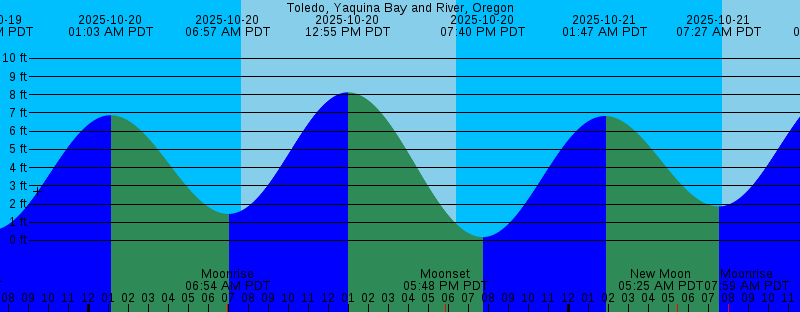 2025-10-19 06:23 PM PDT Sunset 2025-10-19 07:05 PM PDT 0.56 feet Low Tide 2025-10-20 01:03 AM PDT 6.88 feet High Tide 2025-10-20 06:54 AM PDT Moonrise 2025-10-20 06:57 AM PDT 1.46 feet Low Tide 2025-10-20 07:38 AM PDT Sunrise 2025-10-20 12:55 PM PDT 8.13 feet High Tide 2025-10-20 05:48 PM PDT Moonset 2025-10-20 06:22 PM PDT Sunset 2025-10-20 07:40 PM PDT 0.19 feet Low Tide 2025-10-21 01:47 AM PDT 6.83 feet High Tide 2025-10-21 05:25 AM PDT New Moon 2025-10-21 07:27 AM PDT 1.87 feet Low Tide 2025-10-21 07:39 AM PDT Sunrise 2025-10-21 07:59 AM PDT Moonrise 2025-10-21 01:19 PM PDT 8.24 feet High Tide 2025-10-21 06:08 PM PDT Moonset 2025-10-21 06:20 PM PDT Sunset 2025-10-21 08:13 PM PDT -0.06 feet Low Tide 2025-10-22 02:28 AM PDT 6.76 feet High Tide 2025-10-22 07:40 AM PDT Sunrise 2025-10-22 07:57 AM PDT 2.27 feet Low Tide 2025-10-22 09:05 AM PDT Moonrise 2025-10-22 01:44 PM PDT 8.25 feet High Tide 2025-10-22 06:18 PM PDT Sunset 2025-10-22 06:30 PM PDT Moonset 2025-10-22 08:46 PM PDT -0.18 feet Low Tide 2025-10-23 03:09 AM PDT 6.63 feet High Tide 2025-10-23 07:42 AM PDT Sunrise 2025-10-23 08:27 AM PDT 2.65 feet Low Tide 2025-10-23 10:11 AM PDT Moonrise 2025-10-23 02:10 PM PDT 8.18 feet High Tide |