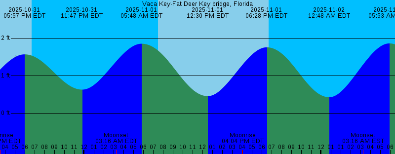 | 2025-10-31 11:52 AM EDT 0.43 feet Low Tide 2025-10-31 03:30 PM EDT Moonrise 2025-10-31 05:57 PM EDT 1.57 feet High Tide 2025-10-31 06:44 PM EDT Sunset 2025-10-31 11:47 PM EDT 0.63 feet Low Tide 2025-11-01 03:16 AM EDT Moonset 2025-11-01 05:48 AM EDT 1.85 feet High Tide 2025-11-01 07:31 AM EDT Sunrise 2025-11-01 12:30 PM EDT 0.46 feet Low Tide 2025-11-01 04:04 PM EDT Moonrise 2025-11-01 06:28 PM EDT 1.76 feet High Tide 2025-11-01 06:43 PM EDT Sunset 2025-11-02 12:48 AM EDT 0.43 feet Low Tide 2025-11-02 03:16 AM EST Moonset 2025-11-02 05:53 AM EST 1.86 feet High Tide 2025-11-02 06:32 AM EST Sunrise 2025-11-02 12:06 PM EST 0.48 feet Low Tide 2025-11-02 03:39 PM EST Moonrise 2025-11-02 05:42 PM EST Sunset 2025-11-02 05:58 PM EST 1.96 feet High Tide 2025-11-03 12:42 AM EST 0.21 feet Low Tide 2025-11-03 04:19 AM EST Moonset 2025-11-03 06:32 AM EST Sunrise 2025-11-03 06:52 AM EST 1.84 feet High Tide 2025-11-03 12:41 PM EST 0.50 feet Low Tide 2025-11-03 04:16 PM EST Moonrise 2025-11-03 05:42 PM EST Sunset 2025-11-03 06:31 PM EST 2.16 feet High Tide 2025-11-04 01:33 AM EST -0.00 feet Low Tide 2025-11-04 05:25 AM EST Moonset 2025-11-04 06:33 AM EST Sunrise 2025-11-04 07:47 AM EST 1.77 feet High Tide | Other Nearby Tide Stations |