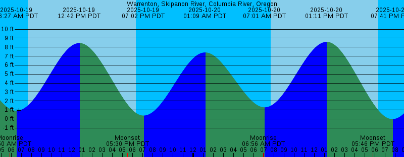 2025-10-19 05:50 AM PDT Moonrise 2025-10-19 06:27 AM PDT 0.92 feet Low Tide 2025-10-19 07:38 AM PDT Sunrise 2025-10-19 12:42 PM PDT 8.46 feet High Tide 2025-10-19 05:30 PM PDT Moonset 2025-10-19 06:21 PM PDT Sunset 2025-10-19 07:02 PM PDT 0.38 feet Low Tide 2025-10-20 01:09 AM PDT 7.42 feet High Tide 2025-10-20 06:56 AM PDT Moonrise 2025-10-20 07:01 AM PDT 1.30 feet Low Tide 2025-10-20 07:40 AM PDT Sunrise 2025-10-20 01:11 PM PDT 8.59 feet High Tide 2025-10-20 05:46 PM PDT Moonset 2025-10-20 06:19 PM PDT Sunset 2025-10-20 07:41 PM PDT -0.02 feet Low Tide 2025-10-21 01:51 AM PDT 7.36 feet High Tide 2025-10-21 05:25 AM PDT New Moon 2025-10-21 07:33 AM PDT 1.74 feet Low Tide 2025-10-21 07:41 AM PDT Sunrise 2025-10-21 08:02 AM PDT Moonrise 2025-10-21 01:37 PM PDT 8.62 feet High Tide 2025-10-21 06:04 PM PDT Moonset 2025-10-21 06:18 PM PDT Sunset 2025-10-21 08:17 PM PDT -0.25 feet Low Tide 2025-10-22 02:33 AM PDT 7.24 feet High Tide 2025-10-22 07:43 AM PDT Sunrise 2025-10-22 08:04 AM PDT 2.21 feet Low Tide 2025-10-22 09:10 AM PDT Moonrise 2025-10-22 02:01 PM PDT 8.59 feet High Tide 2025-10-22 06:16 PM PDT Sunset 2025-10-22 06:25 PM PDT Moonset 2025-10-22 08:51 PM PDT -0.33 feet Low Tide 2025-10-23 03:14 AM PDT 7.06 feet High Tide |