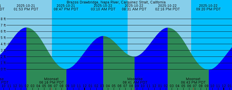 2025-10-21 02:24 AM PDT 5.46 feet High Tide 2025-10-21 05:25 AM PDT New Moon 2025-10-21 07:24 AM PDT Sunrise 2025-10-21 07:40 AM PDT Moonrise 2025-10-21 08:01 AM PDT 1.66 feet Low Tide 2025-10-21 01:53 PM PDT 6.64 feet High Tide 2025-10-21 06:16 PM PDT Moonset 2025-10-21 06:22 PM PDT Sunset 2025-10-21 08:47 PM PDT 0.04 feet Low Tide 2025-10-22 03:10 AM PDT 5.29 feet High Tide 2025-10-22 07:25 AM PDT Sunrise 2025-10-22 08:31 AM PDT 2.01 feet Low Tide 2025-10-22 08:41 AM PDT Moonrise 2025-10-22 02:16 PM PDT 6.62 feet High Tide 2025-10-22 06:21 PM PDT Sunset 2025-10-22 06:43 PM PDT Moonset 2025-10-22 09:20 PM PDT -0.09 feet Low Tide 2025-10-23 03:56 AM PDT 5.12 feet High Tide 2025-10-23 07:26 AM PDT Sunrise 2025-10-23 09:02 AM PDT 2.34 feet Low Tide 2025-10-23 09:42 AM PDT Moonrise 2025-10-23 02:41 PM PDT 6.54 feet High Tide 2025-10-23 06:19 PM PDT Sunset 2025-10-23 07:15 PM PDT Moonset 2025-10-23 09:54 PM PDT -0.13 feet Low Tide 2025-10-24 04:44 AM PDT 4.95 feet High Tide 2025-10-24 07:27 AM PDT Sunrise 2025-10-24 09:34 AM PDT 2.62 feet Low Tide 2025-10-24 10:43 AM PDT Moonrise 2025-10-24 03:10 PM PDT 6.42 feet High Tide 2025-10-24 06:18 PM PDT Sunset 2025-10-24 07:53 PM PDT Moonset 2025-10-24 10:32 PM PDT -0.10 feet Low Tide |