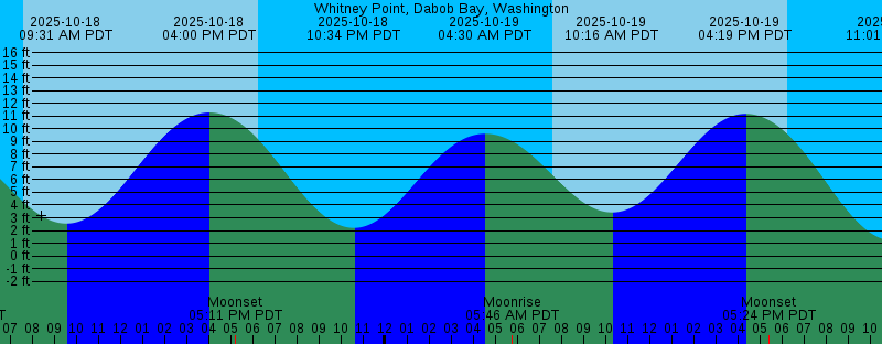 2025-10-18 03:34 AM PDT 9.11 feet High Tide 2025-10-18 04:38 AM PDT Moonrise 2025-10-18 07:35 AM PDT Sunrise 2025-10-18 09:31 AM PDT 2.54 feet Low Tide 2025-10-18 04:00 PM PDT 11.29 feet High Tide 2025-10-18 05:11 PM PDT Moonset 2025-10-18 06:16 PM PDT Sunset 2025-10-18 10:34 PM PDT 2.20 feet Low Tide 2025-10-19 04:30 AM PDT 9.62 feet High Tide 2025-10-19 05:46 AM PDT Moonrise 2025-10-19 07:36 AM PDT Sunrise 2025-10-19 10:16 AM PDT 3.42 feet Low Tide 2025-10-19 04:19 PM PDT 11.18 feet High Tide 2025-10-19 05:24 PM PDT Moonset 2025-10-19 06:14 PM PDT Sunset 2025-10-19 11:01 PM PDT 1.20 feet Low Tide 2025-10-20 05:19 AM PDT 10.09 feet High Tide 2025-10-20 06:54 AM PDT Moonrise 2025-10-20 07:38 AM PDT Sunrise 2025-10-20 10:57 AM PDT 4.40 feet Low Tide 2025-10-20 04:37 PM PDT 11.04 feet High Tide 2025-10-20 05:39 PM PDT Moonset 2025-10-20 06:12 PM PDT Sunset 2025-10-20 11:26 PM PDT 0.36 feet Low Tide 2025-10-21 05:25 AM PDT New Moon 2025-10-21 06:02 AM PDT 10.51 feet High Tide 2025-10-21 07:40 AM PDT Sunrise 2025-10-21 08:02 AM PDT Moonrise 2025-10-21 11:35 AM PDT 5.40 feet Low Tide 2025-10-21 04:57 PM PDT 10.86 feet High Tide 2025-10-21 05:55 PM PDT Moonset 2025-10-21 06:11 PM PDT Sunset 2025-10-21 11:52 PM PDT -0.32 feet Low Tide |