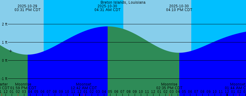 2025-10-29 11:22 AM CDT First Quarter 2025-10-29 01:59 PM CDT Moonrise 2025-10-29 03:31 PM CDT 0.33 feet Low Tide 2025-10-29 06:12 PM CDT Sunset 2025-10-30 12:42 AM CDT Moonset 2025-10-30 04:31 AM CDT 1.88 feet High Tide 2025-10-30 07:08 AM CDT Sunrise 2025-10-30 02:35 PM CDT Moonrise 2025-10-30 04:10 PM CDT 0.43 feet Low Tide 2025-10-30 06:11 PM CDT Sunset 2025-10-31 01:44 AM CDT Moonset 2025-10-31 05:53 AM CDT 1.69 feet High Tide 2025-10-31 07:09 AM CDT Sunrise 2025-10-31 03:08 PM CDT Moonrise 2025-10-31 04:40 PM CDT 0.61 feet Low Tide 2025-10-31 06:10 PM CDT Sunset 2025-11-01 02:46 AM CDT Moonset 2025-11-01 07:10 AM CDT Sunrise 2025-11-01 08:03 AM CDT 1.46 feet High Tide 2025-11-01 03:40 PM CDT Moonrise 2025-11-01 04:53 PM CDT 0.85 feet Low Tide 2025-11-01 06:09 PM CDT Sunset 2025-11-01 11:30 PM CDT 1.16 feet High Tide 2025-11-02 02:50 AM CST Moonset 2025-11-02 03:34 AM CST 1.03 feet Low Tide 2025-11-02 06:10 AM CST Sunrise |