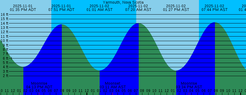 2025-11-01 01:11 AM ADT 3.76 feet Low Tide 2025-11-01 02:56 AM ADT Moonset 2025-11-01 07:29 AM ADT 13.20 feet High Tide 2025-11-01 08:00 AM ADT Sunrise 2025-11-01 01:35 PM ADT 4.08 feet Low Tide 2025-11-01 04:13 PM ADT Moonrise 2025-11-01 06:14 PM ADT Sunset 2025-11-01 07:51 PM ADT 13.78 feet High Tide 2025-11-02 01:01 AM AST 3.24 feet Low Tide 2025-11-02 03:11 AM AST Moonset 2025-11-02 07:02 AM AST Sunrise 2025-11-02 07:20 AM AST 14.05 feet High Tide 2025-11-02 01:27 PM AST 3.22 feet Low Tide 2025-11-02 03:34 PM AST Moonrise 2025-11-02 05:13 PM AST Sunset 2025-11-02 07:44 PM AST 14.26 feet High Tide 2025-11-03 01:48 AM AST 2.73 feet Low Tide 2025-11-03 04:29 AM AST Moonset 2025-11-03 07:03 AM AST Sunrise 2025-11-03 08:08 AM AST 14.93 feet High Tide 2025-11-03 02:18 PM AST 2.34 feet Low Tide 2025-11-03 03:56 PM AST Moonrise 2025-11-03 05:11 PM AST Sunset 2025-11-03 08:35 PM AST 14.66 feet High Tide 2025-11-04 02:34 AM AST 2.30 feet Low Tide 2025-11-04 05:50 AM AST Moonset 2025-11-04 07:04 AM AST Sunrise 2025-11-04 08:55 AM AST 15.71 feet High Tide 2025-11-04 03:07 PM AST 1.57 feet Low Tide 2025-11-04 04:21 PM AST Moonrise 2025-11-04 05:10 PM AST Sunset |